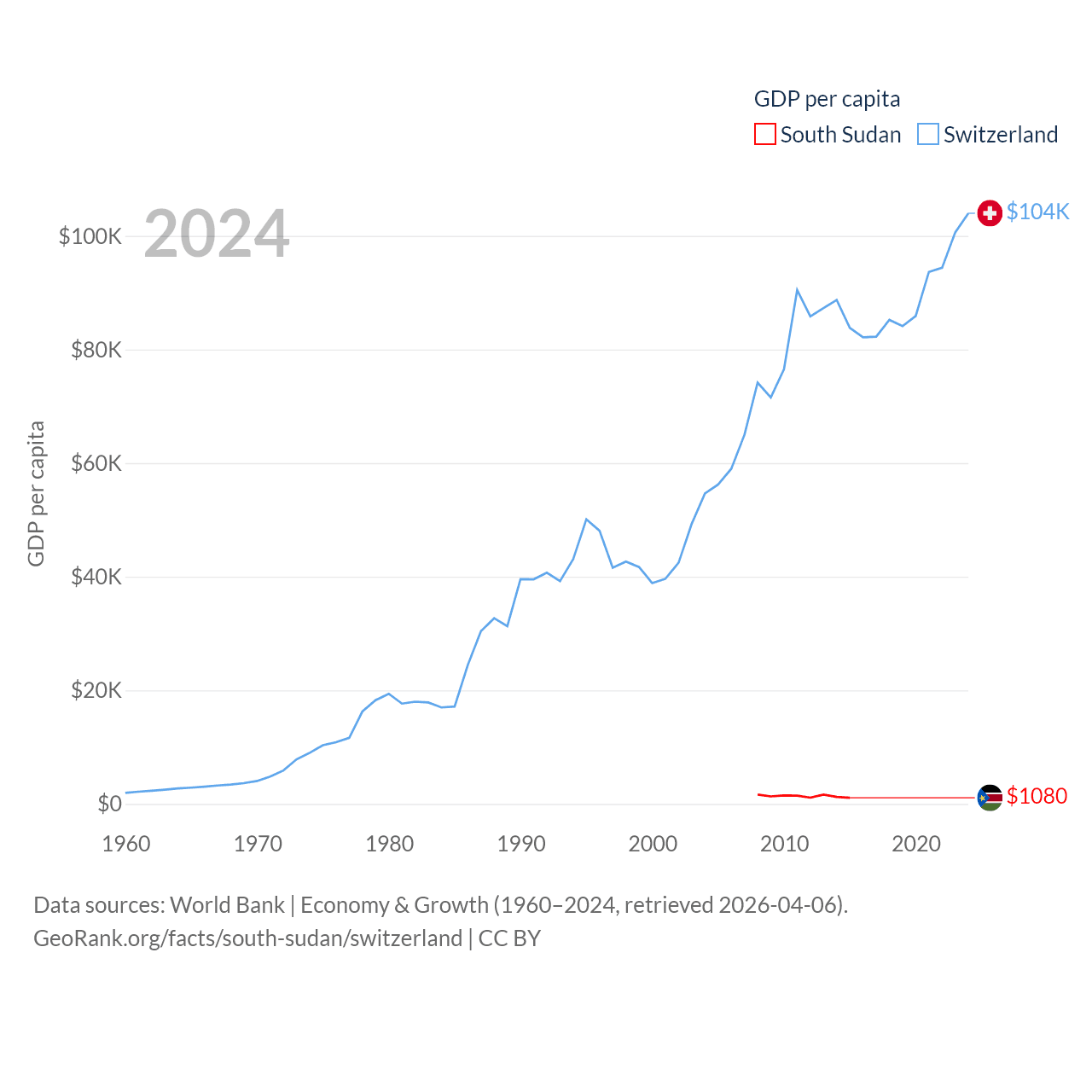 By GDP, South Sudan ranks 149/197 ($12B) and Switzerland ranks 20/197 ($937B). By GDP per capita, South Sudan ranks 175/197 ($1,080), while Switzerland ranks 5/197 ($103,998).