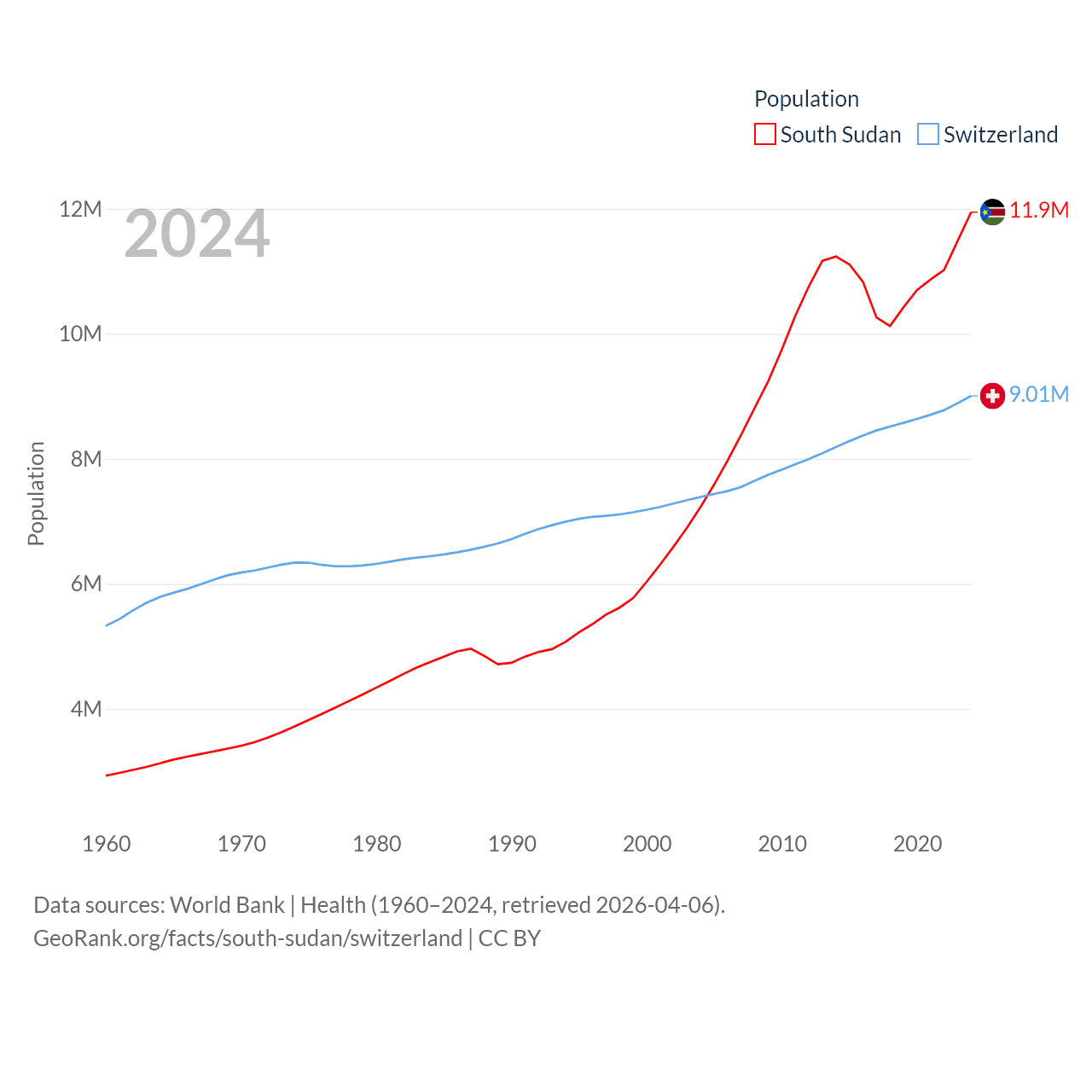 South Sudan has a population of 11.9M (ranked 81/197), compared with 9.01M in Switzerland (ranked 101/197). South Sudan's land area is 243,990 sq mi versus 15,255 sq mi for Switzerland (ranked 41st vs. 131st).