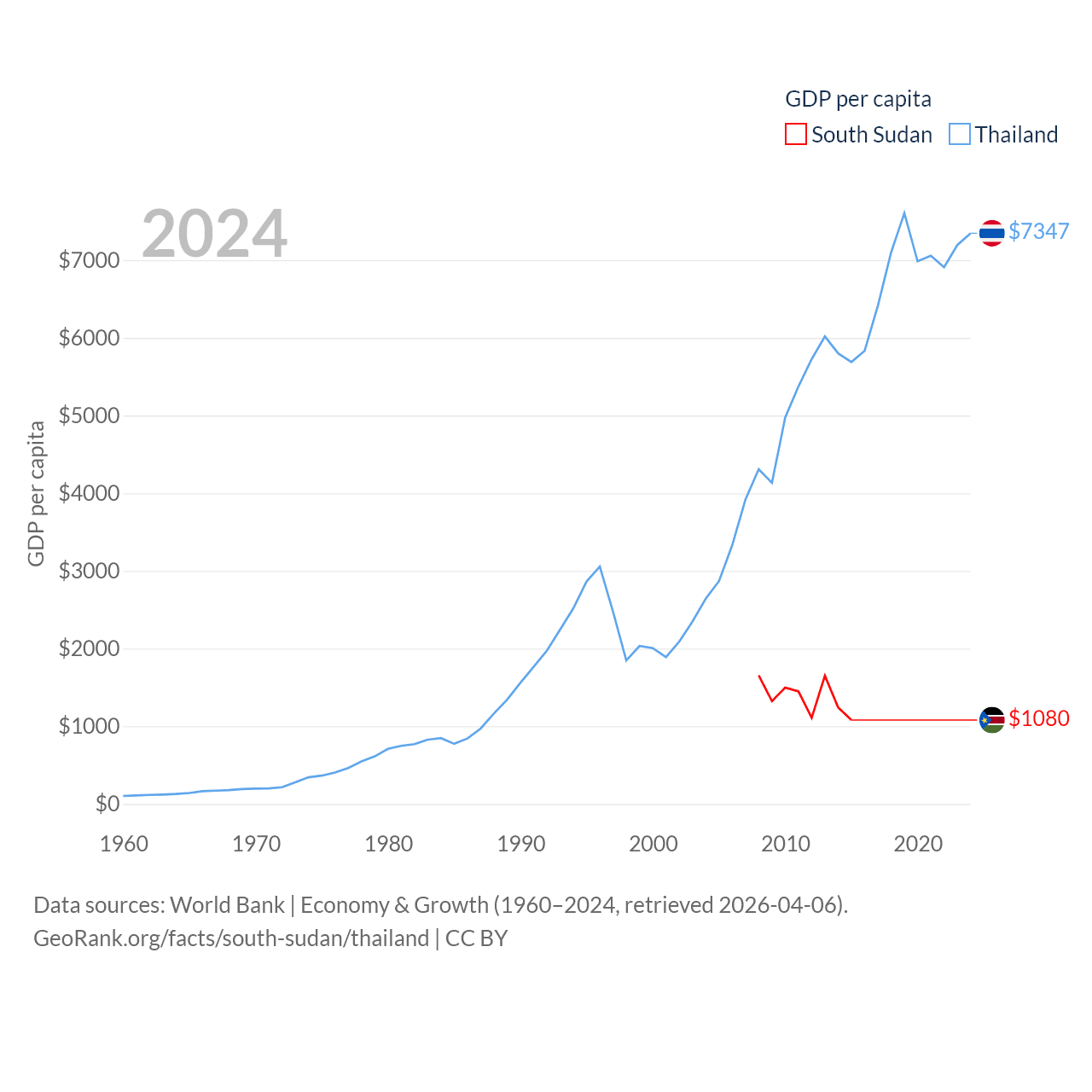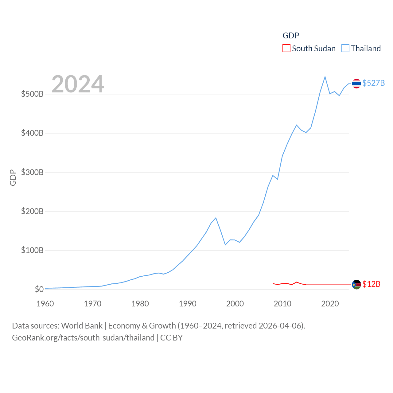 By GDP, South Sudan ranks 149/197 ($12B) and Thailand ranks 31/197 ($527B). By GDP per capita, South Sudan ranks 175/197 ($1,080), while Thailand ranks 100/197 ($7,347).