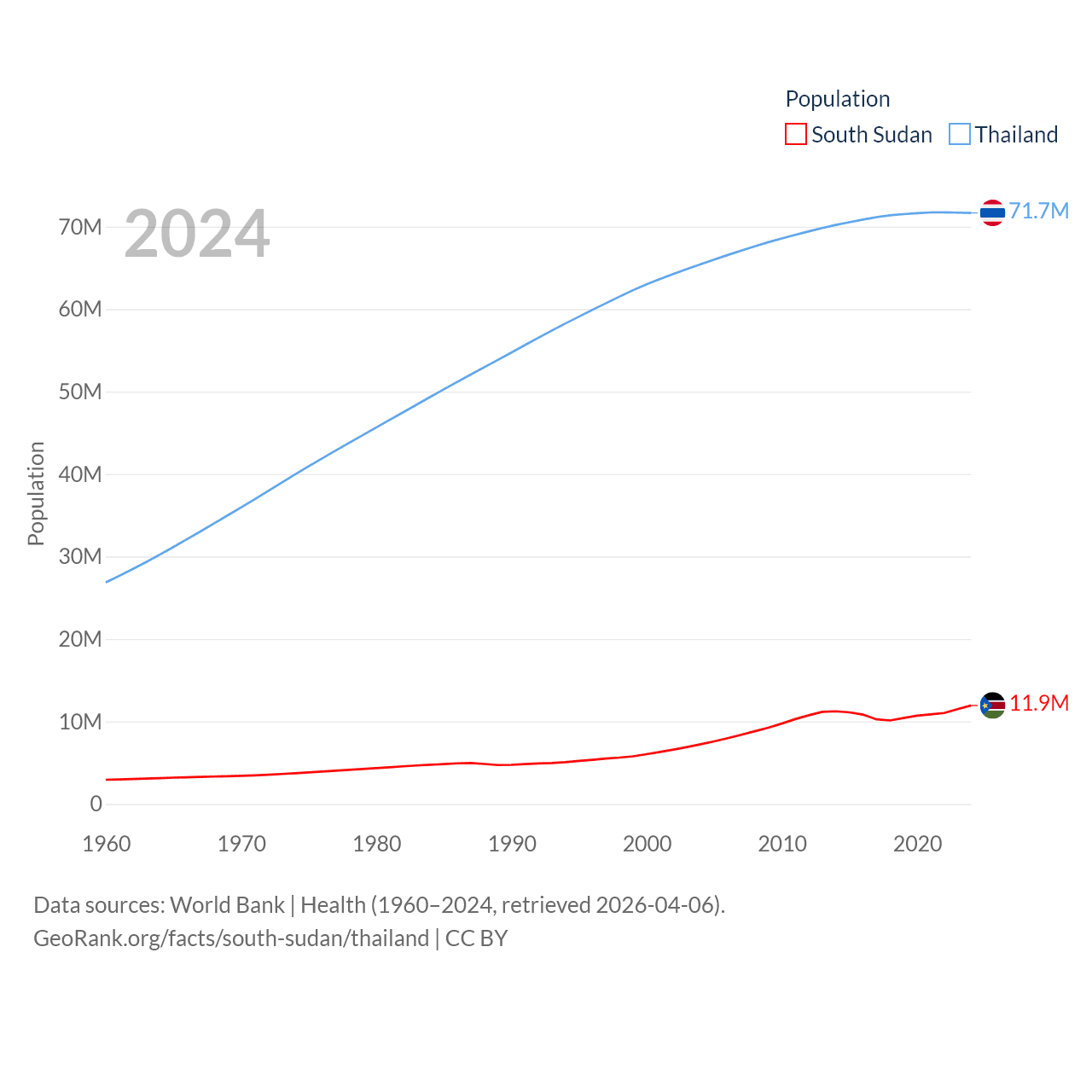 South Sudan has a population of 11.9M (ranked 81/197), compared with 71.7M in Thailand (ranked 20/197). South Sudan's land area is 243,990 sq mi versus 197,256 sq mi for Thailand (ranked 41st vs. 50th).