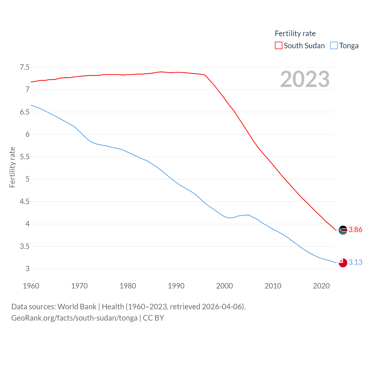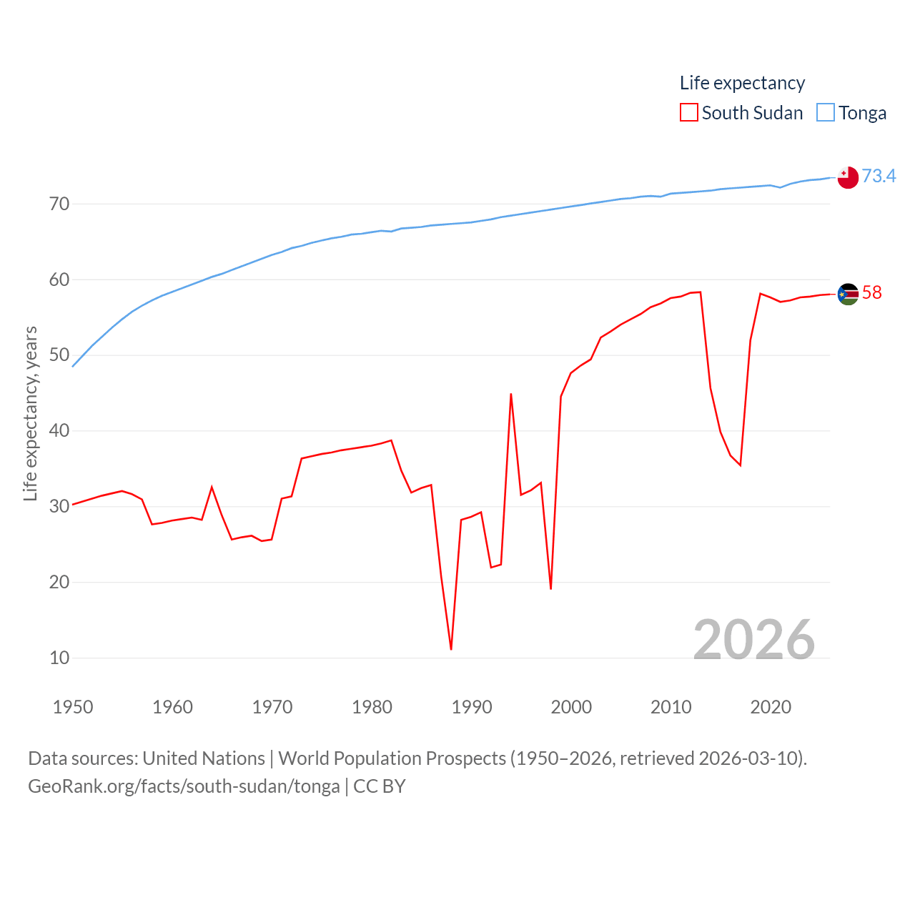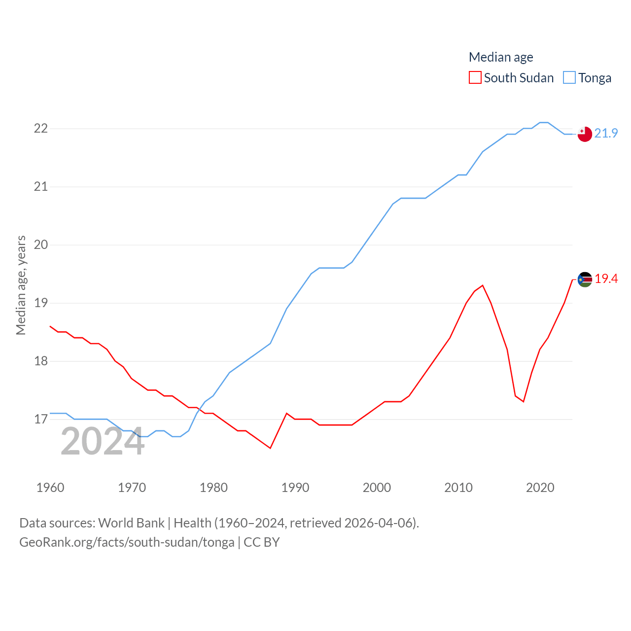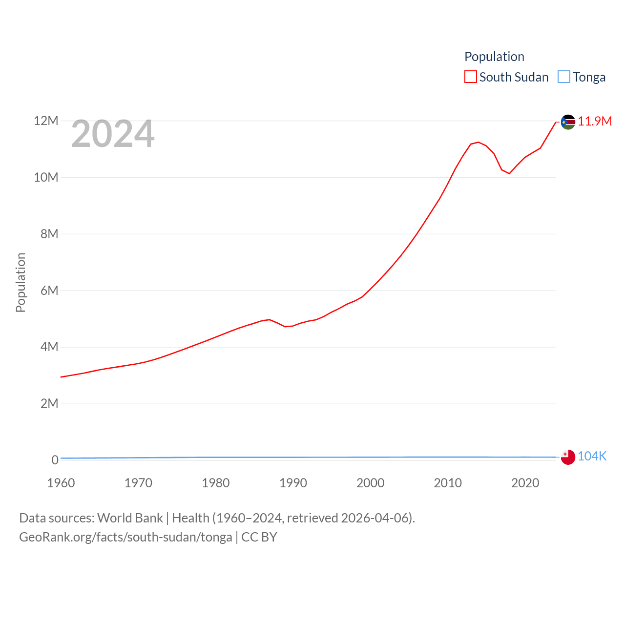 South Sudan has a population of 11.9M (ranked 81/197), compared with 104K in Tonga (ranked 183/197). South Sudan's land area is 243,990 sq mi versus 278 sq mi for Tonga (ranked 41st vs. 176th).