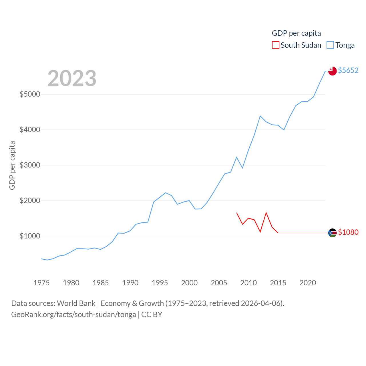 By GDP, South Sudan ranks 149/197 ($12B) and Tonga ranks 191/197 ($591M). By GDP per capita, South Sudan ranks 175/197 ($1,080), while Tonga ranks 115/197 ($5,652).