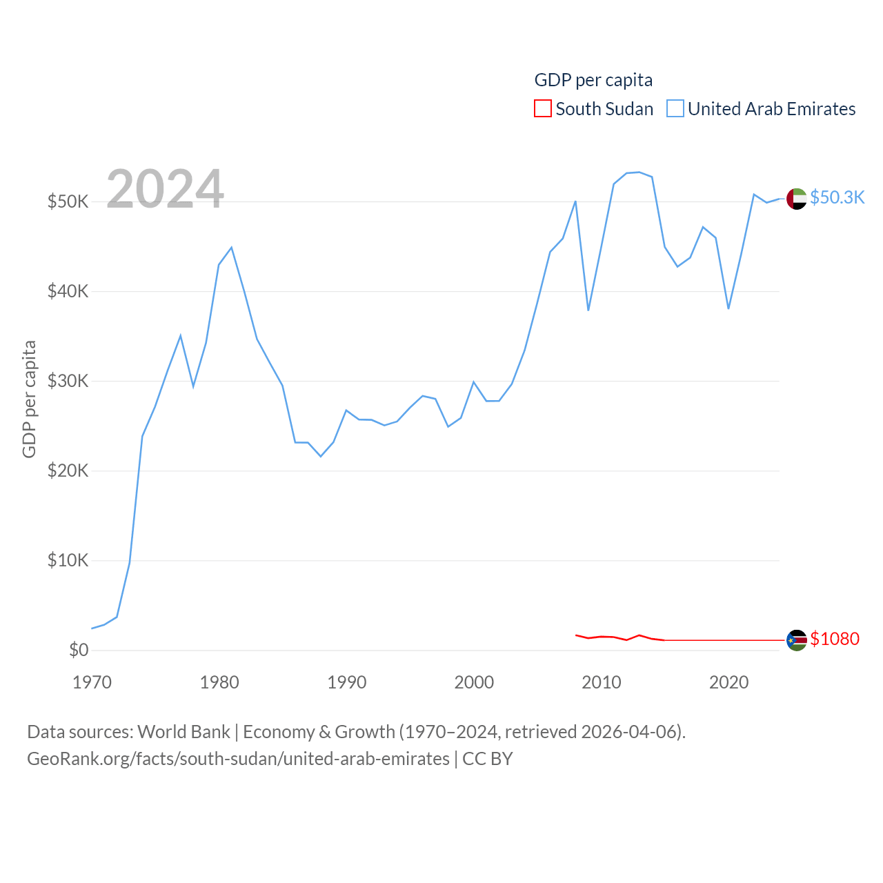 By GDP, South Sudan ranks 149/197 ($12B) and The United Arab Emirates ranks 27/197 ($552B). By GDP per capita, South Sudan ranks 175/197 ($1,080), while The United Arab Emirates ranks 24/197 ($50,274).