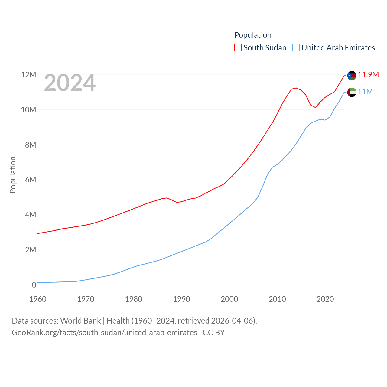 South Sudan has a population of 11.9M (ranked 81/197), compared with 11M in The United Arab Emirates (ranked 86/197). South Sudan's land area is 243,990 sq mi versus 27,421 sq mi for The United Arab Emirates (ranked 41st vs. 117th).