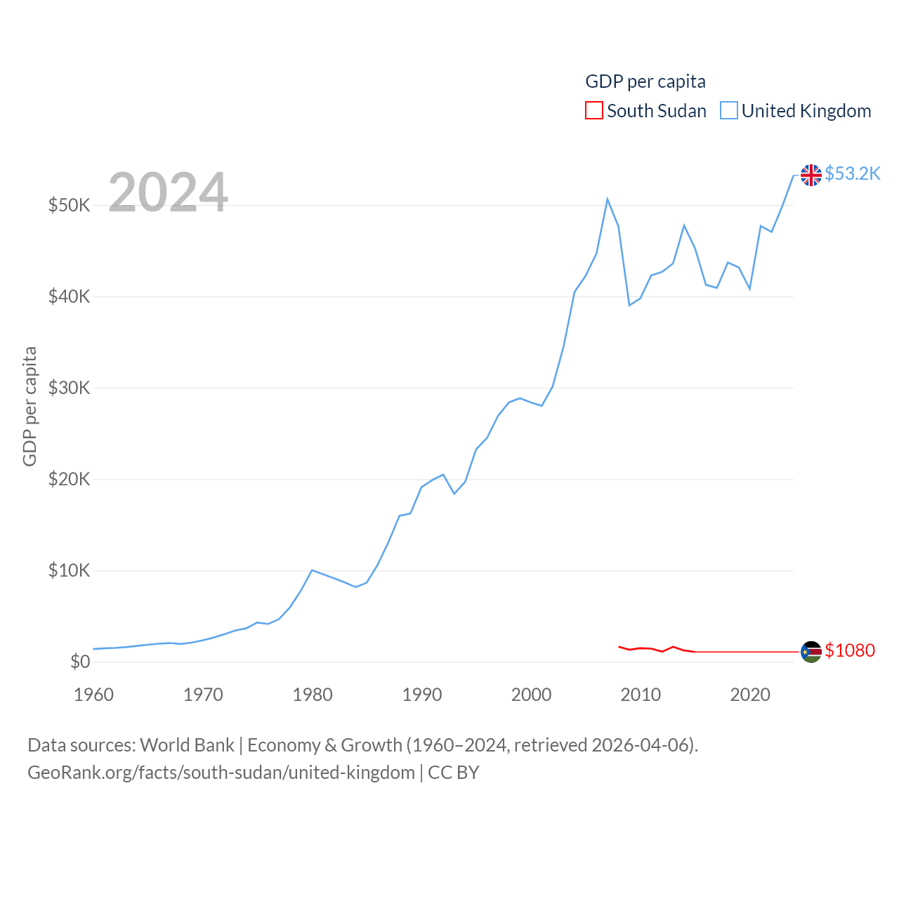 By GDP, South Sudan ranks 149/197 ($12B) and The United Kingdom ranks 6/197 ($3.69T). By GDP per capita, South Sudan ranks 175/197 ($1,080), while The United Kingdom ranks 22/197 ($53,246).
