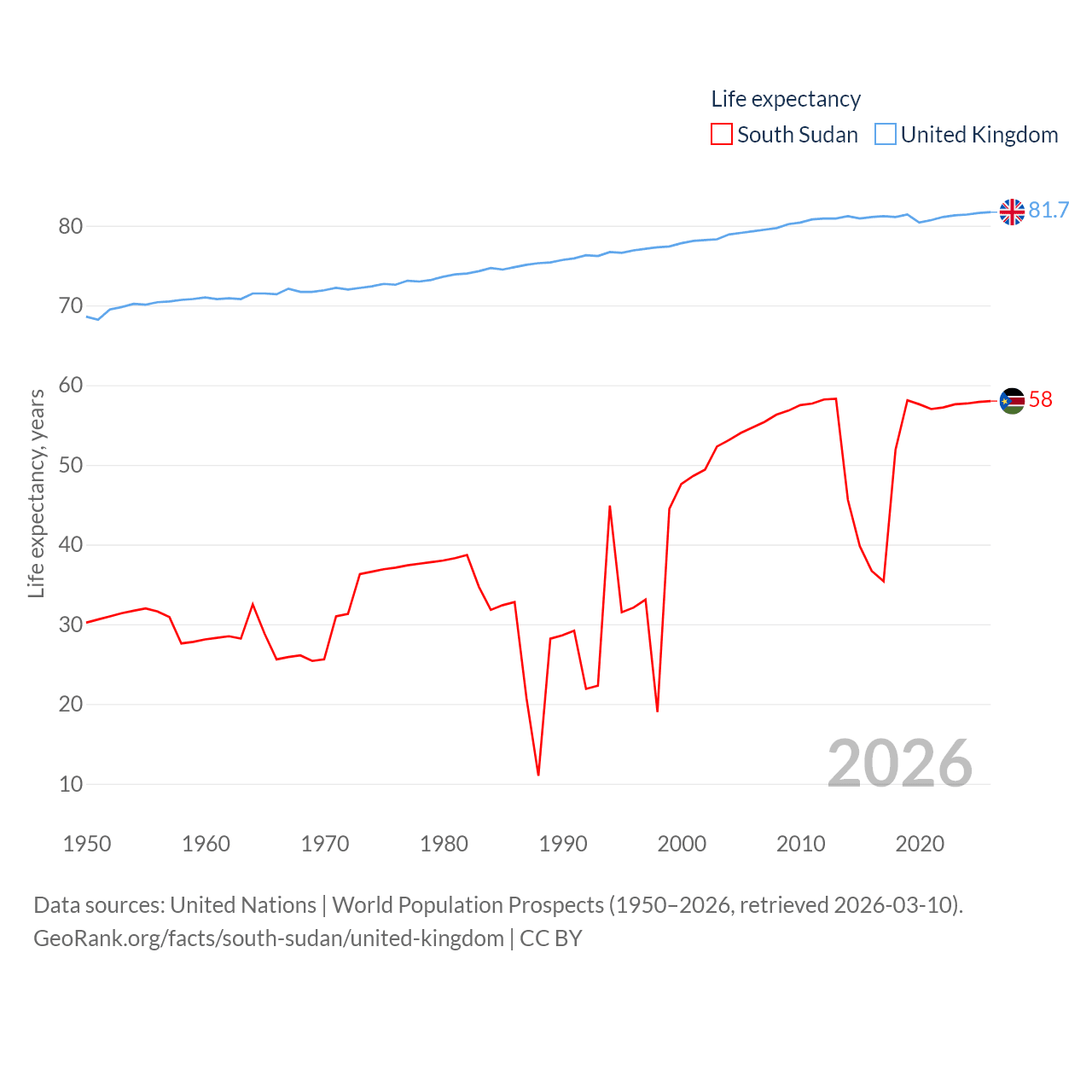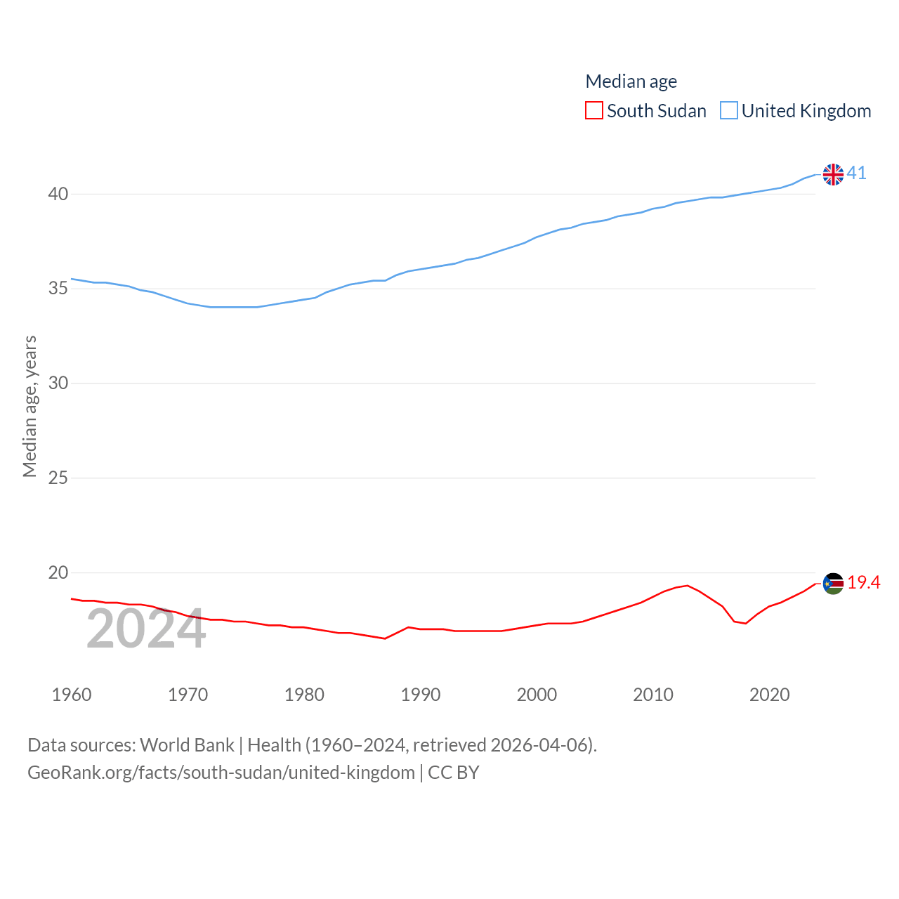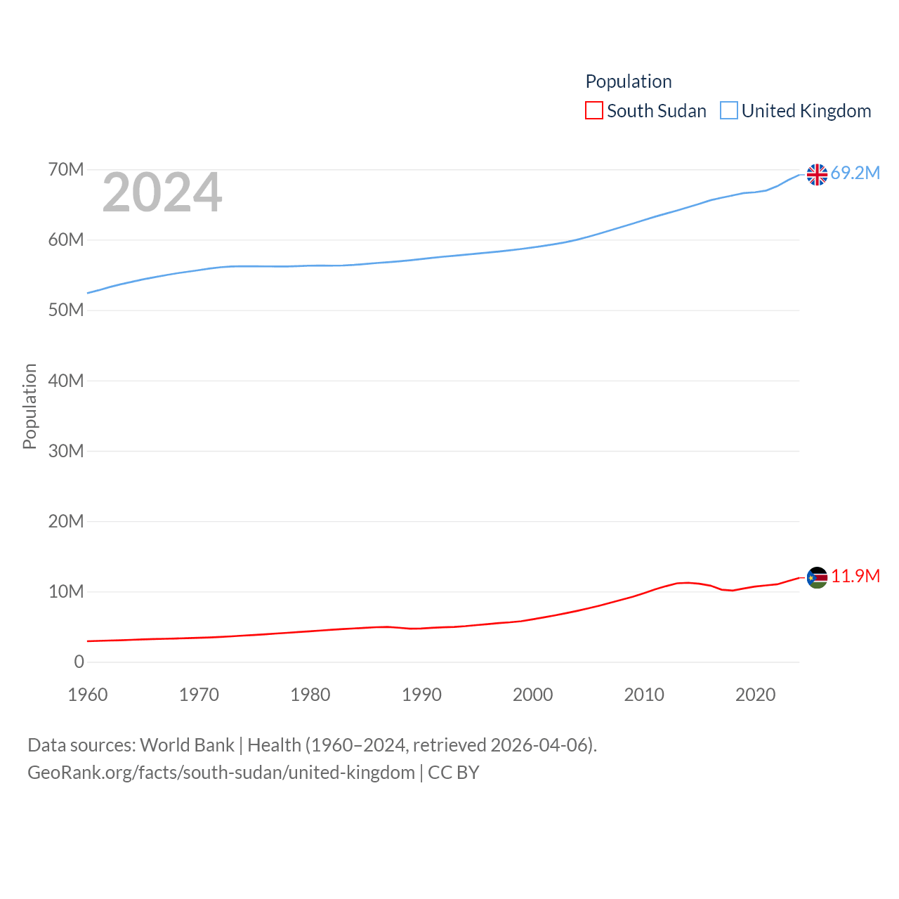 South Sudan has a population of 11.9M (ranked 81/197), compared with 69.2M in The United Kingdom (ranked 21/197). South Sudan's land area is 243,990 sq mi versus 93,410 sq mi for The United Kingdom (ranked 41st vs. 78th).