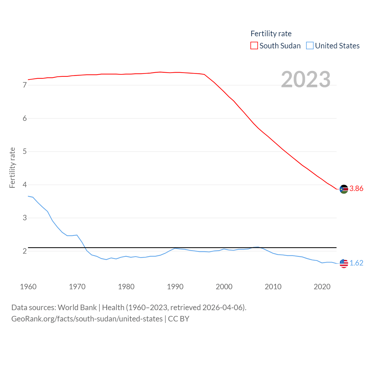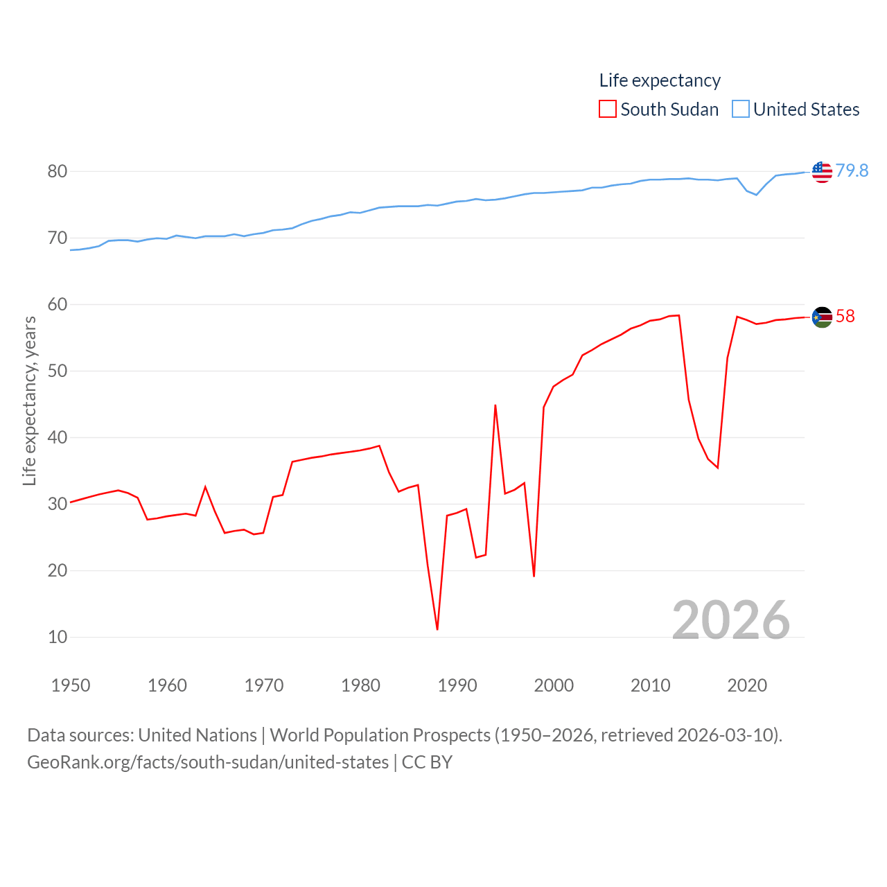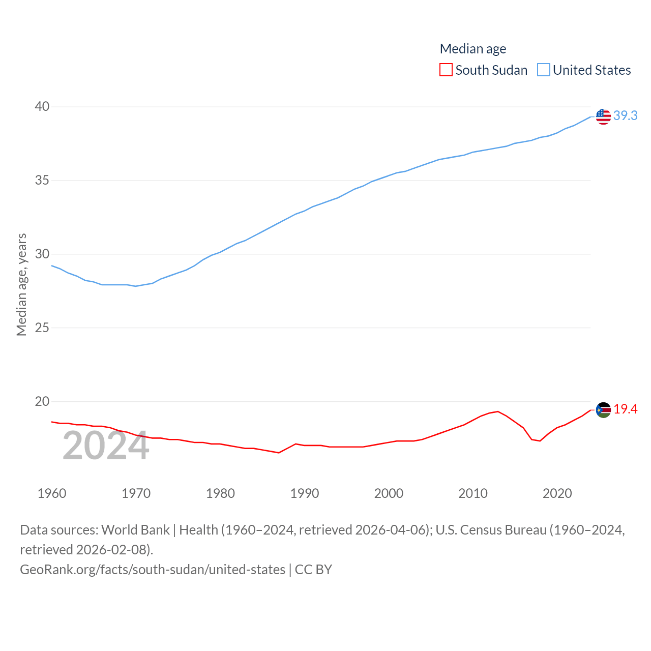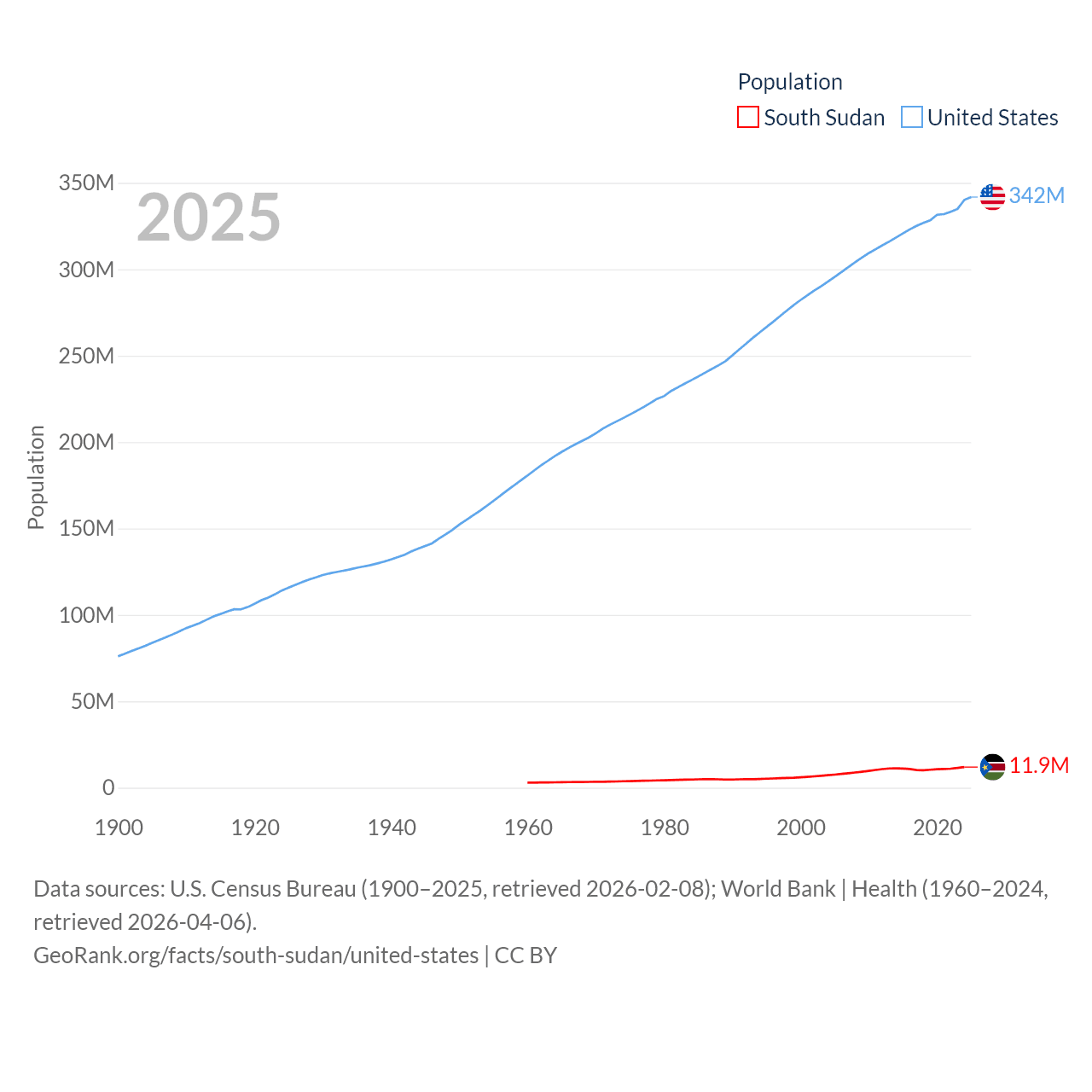 South Sudan has a population of 11.9M (ranked 81/197), compared with 342M in The United States (ranked 3/197). South Sudan's land area is 243,990 sq mi versus 3,531,839 sq mi for The United States (ranked 41st vs. 3rd).