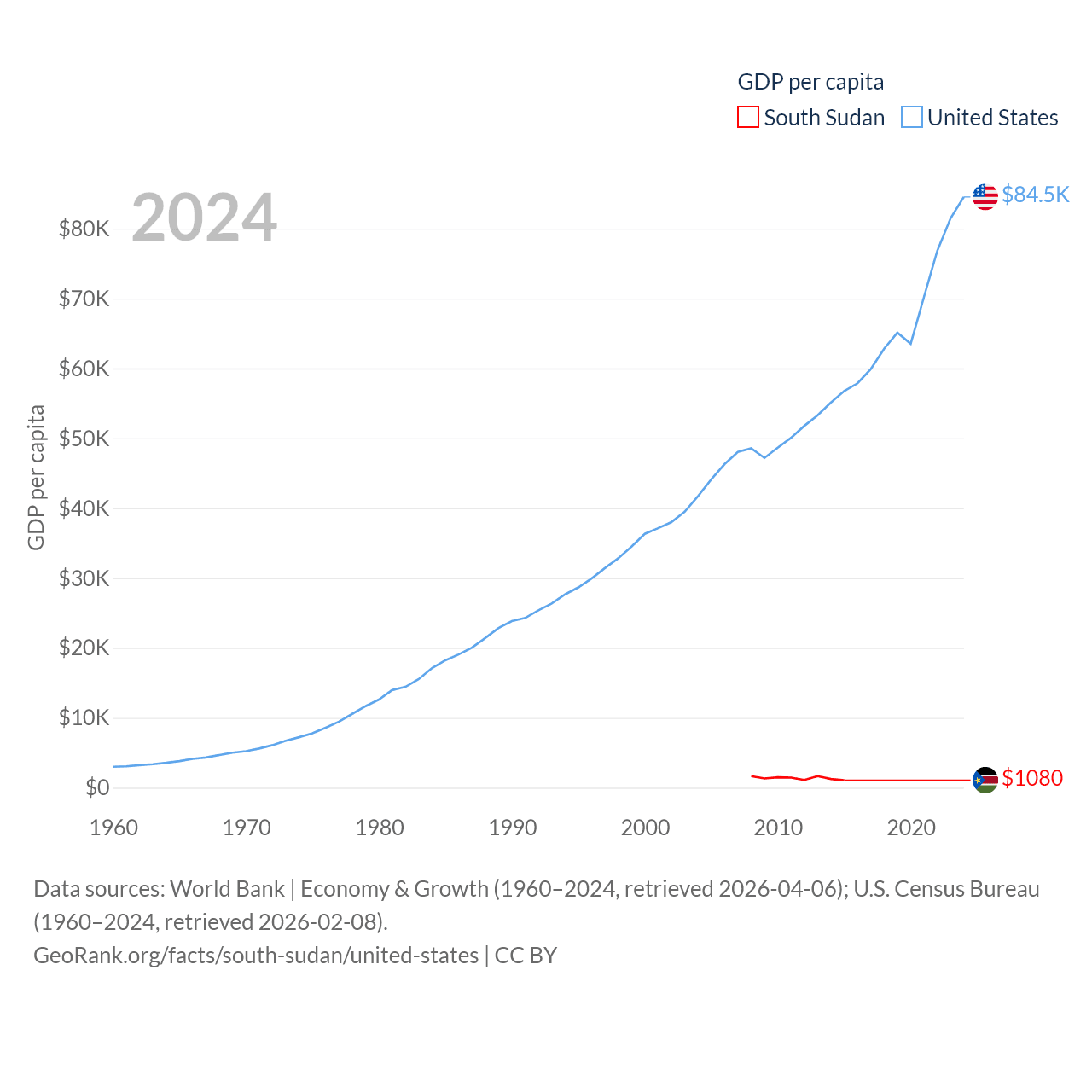 By GDP, South Sudan ranks 149/197 ($12B) and The United States ranks 1/197 ($28.8T). By GDP per capita, South Sudan ranks 175/197 ($1,080), while The United States ranks 10/197 ($84,534).