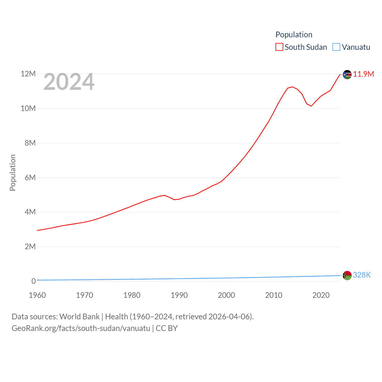 South Sudan has a population of 11.9M (ranked 81/197), compared with 328K in Vanuatu (ranked 174/197). South Sudan's land area is 243,990 sq mi versus 4,707 sq mi for Vanuatu (ranked 41st vs. 157th).