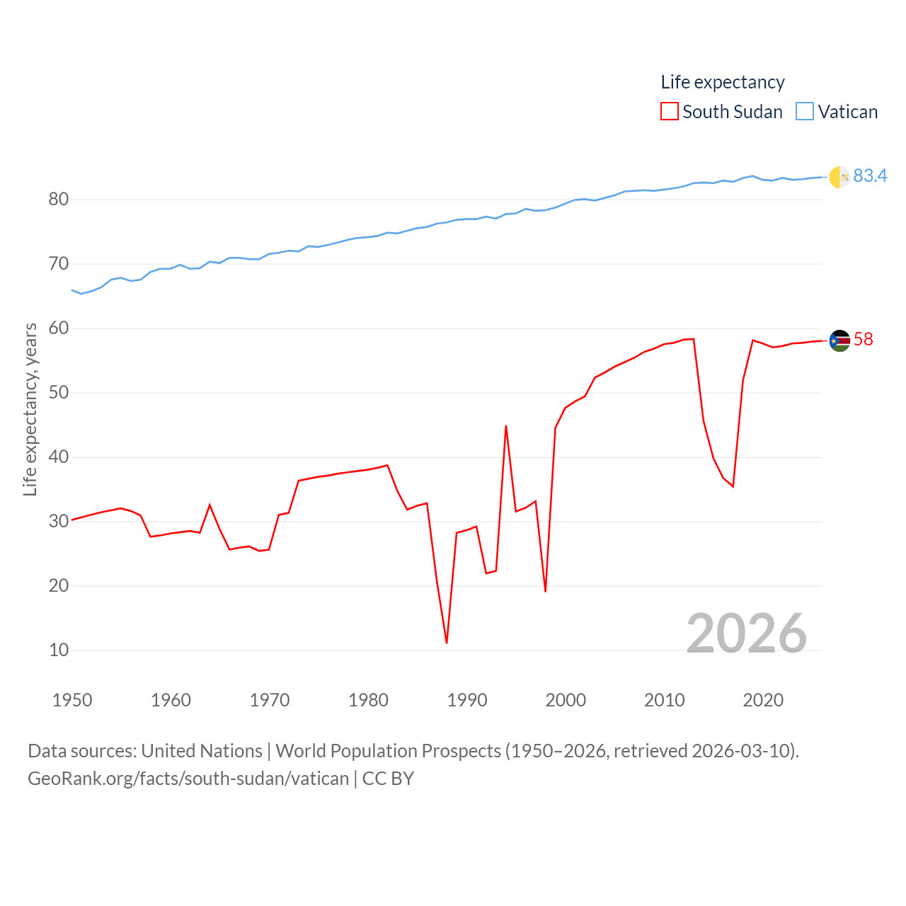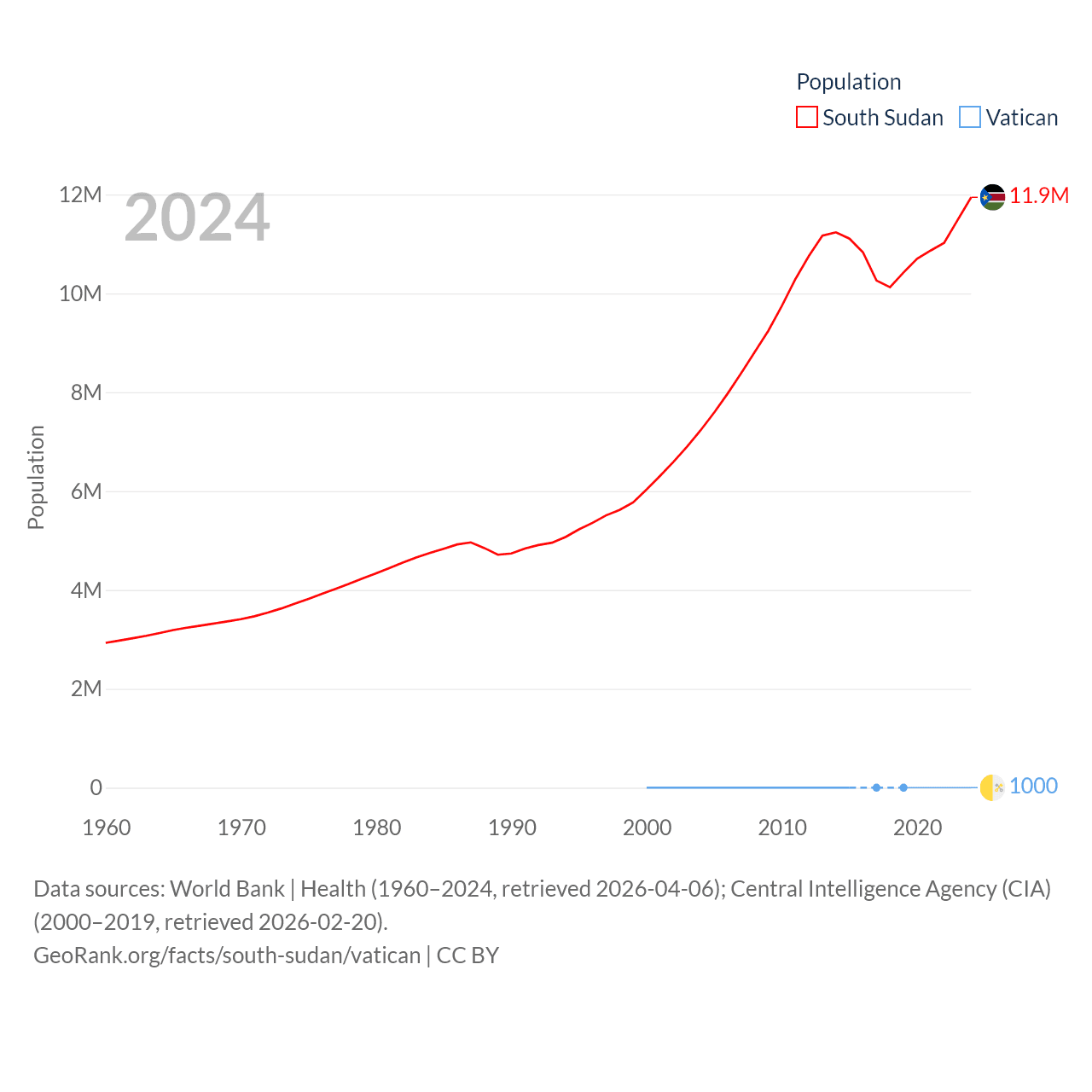 South Sudan has a population of 11.9M (ranked 81/197), compared with 1K in The Vatican (ranked 197/197). South Sudan's land area is 243,990 sq mi versus 0.17 sq mi for The Vatican (ranked 41st vs. 197th).