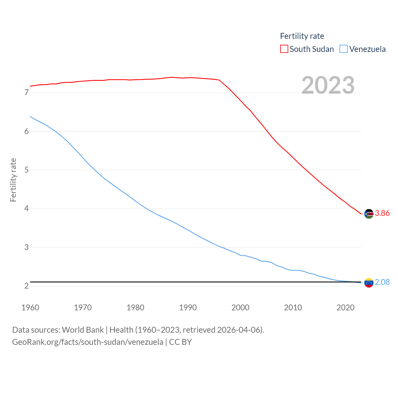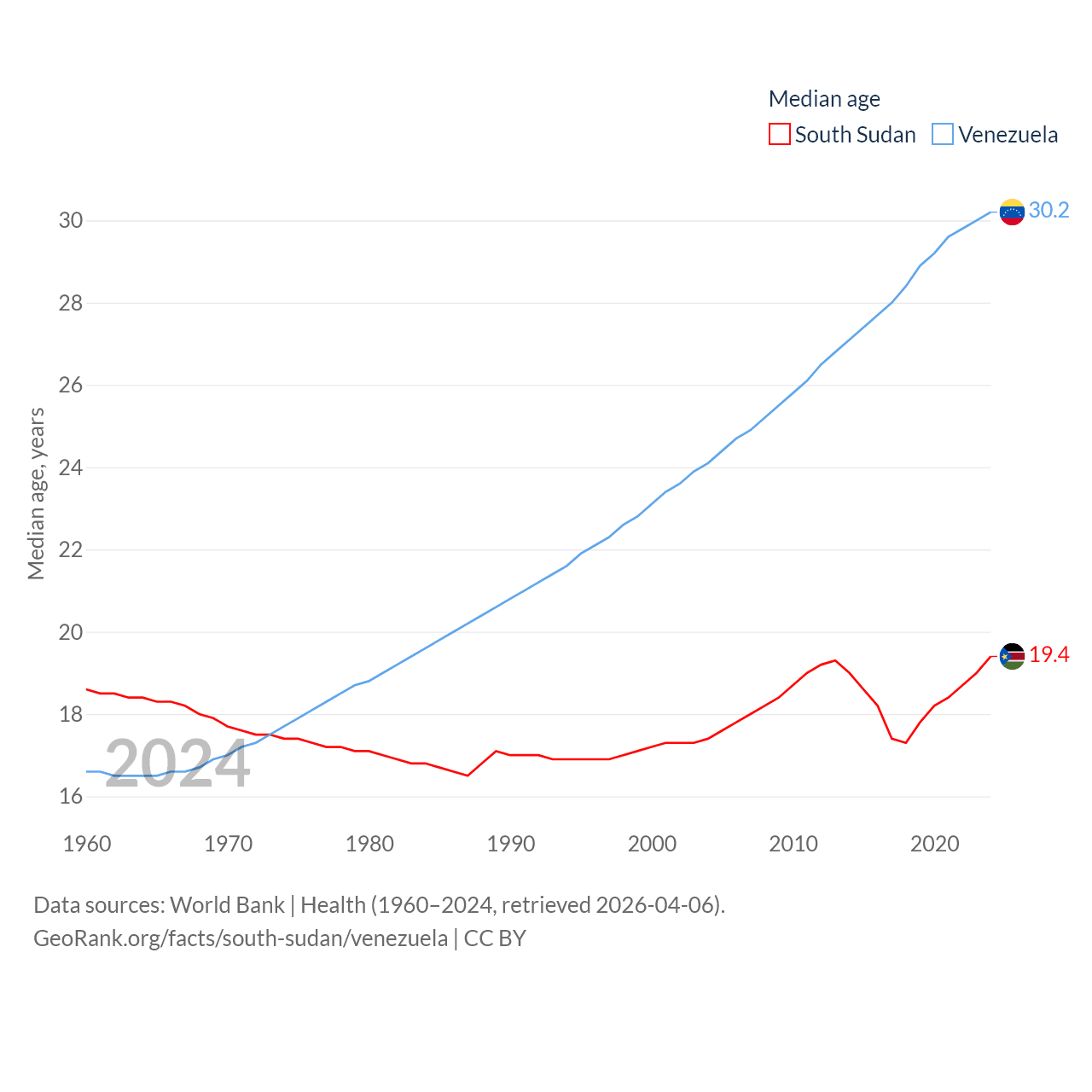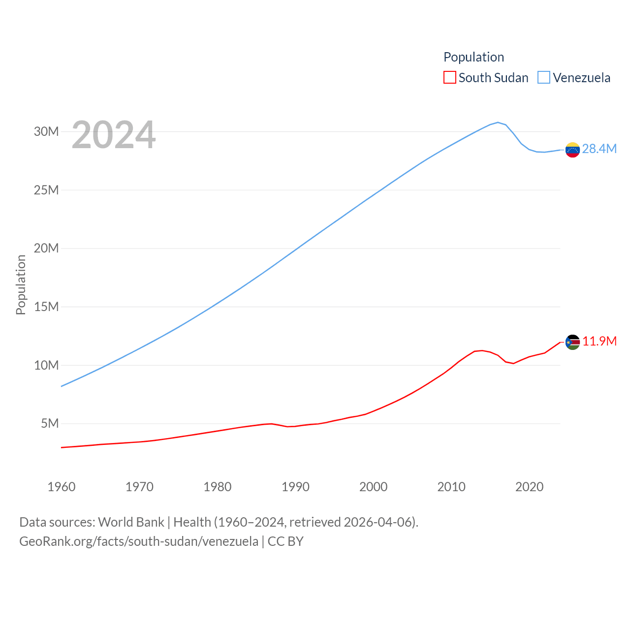 South Sudan has a population of 11.9M (ranked 81/197), compared with 28.4M in Venezuela (ranked 53/197). South Sudan's land area is 243,990 sq mi versus 340,561 sq mi for Venezuela (ranked 41st vs. 32nd).