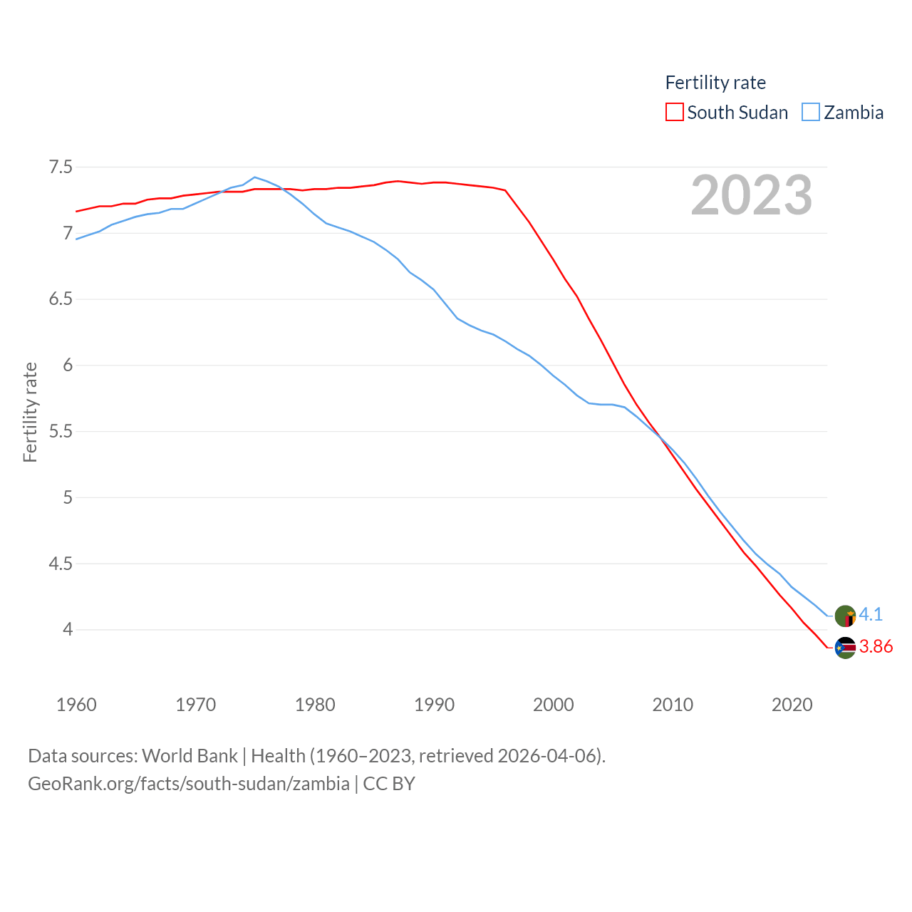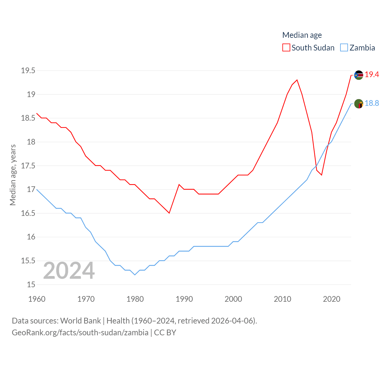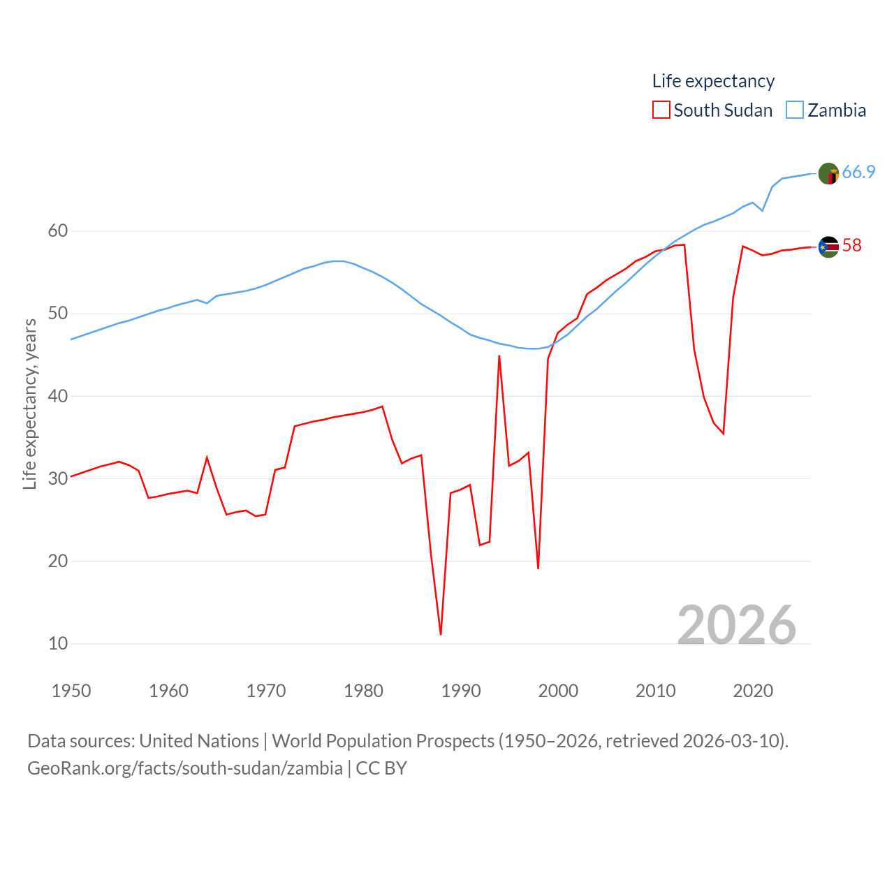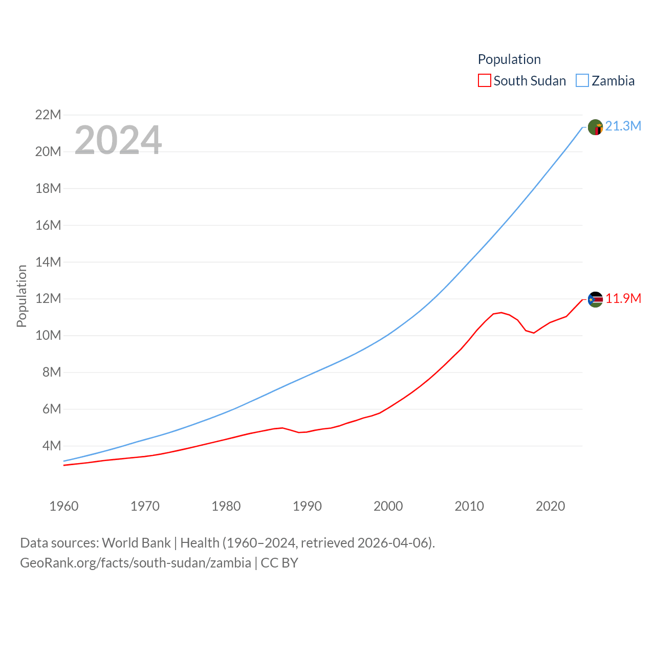 South Sudan has a population of 11.9M (ranked 81/197), compared with 21.3M in Zambia (ranked 63/197). South Sudan's land area is 243,990 sq mi versus 287,024 sq mi for Zambia (ranked 41st vs. 37th).