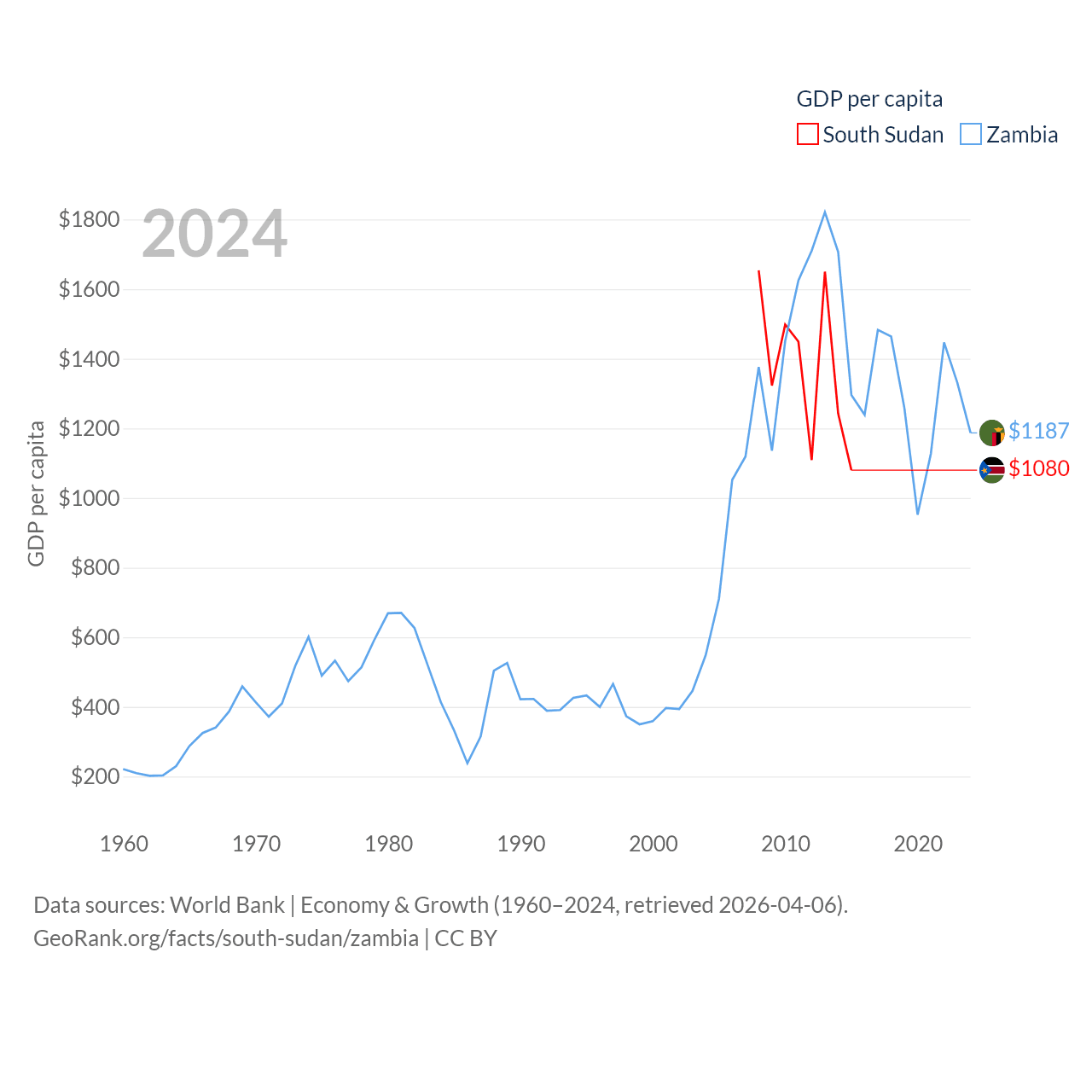 By GDP, South Sudan ranks 149/197 ($12B) and Zambia ranks 116/197 ($25.3B). By GDP per capita, South Sudan ranks 175/197 ($1,080), while Zambia ranks 169/197 ($1,187).