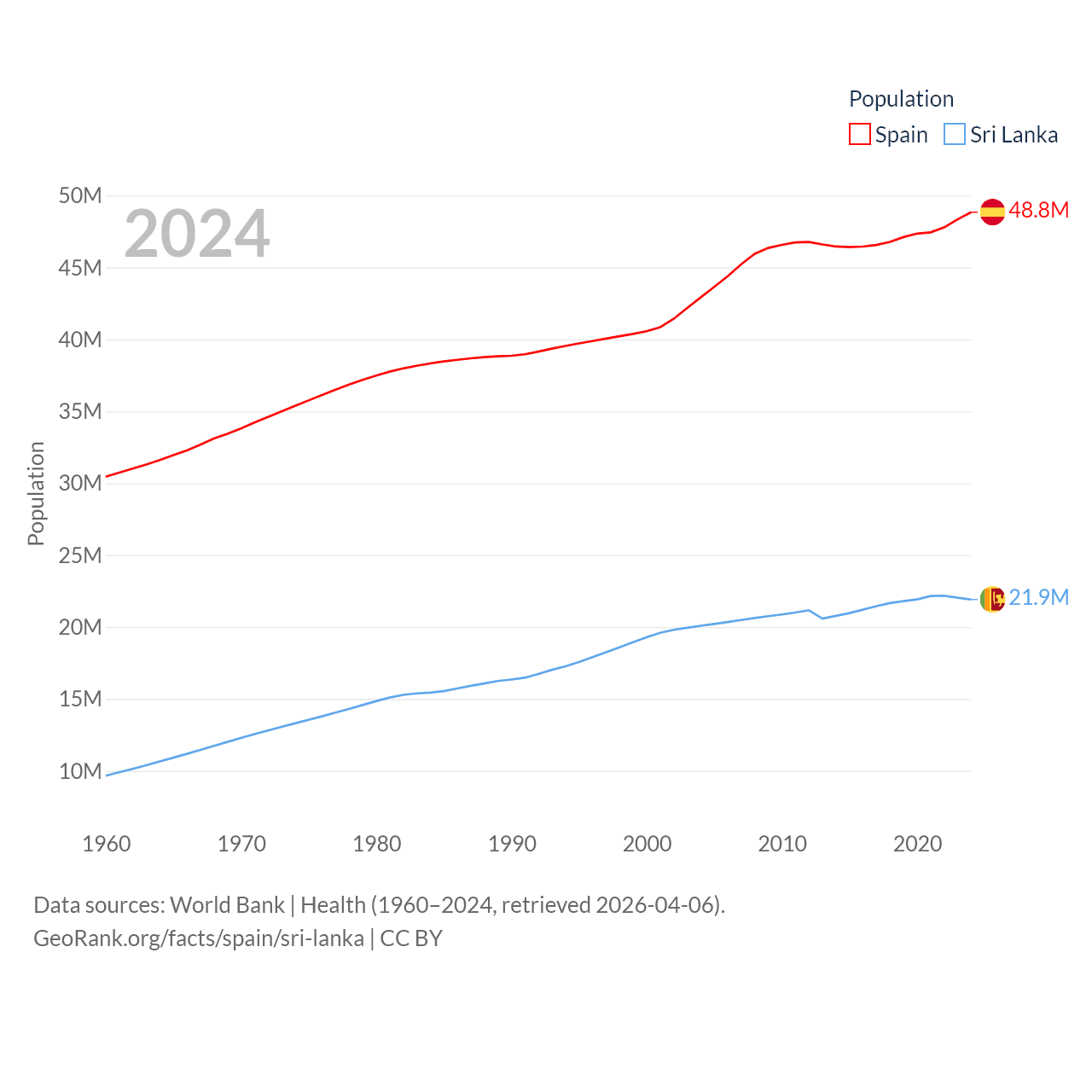 Spain has a population of 48.8M (ranked 32/197), compared with 21.9M in Sri Lanka (ranked 61/197). Spain's land area is 192,934 sq mi versus 23,884 sq mi for Sri Lanka (ranked 51st vs. 122nd).