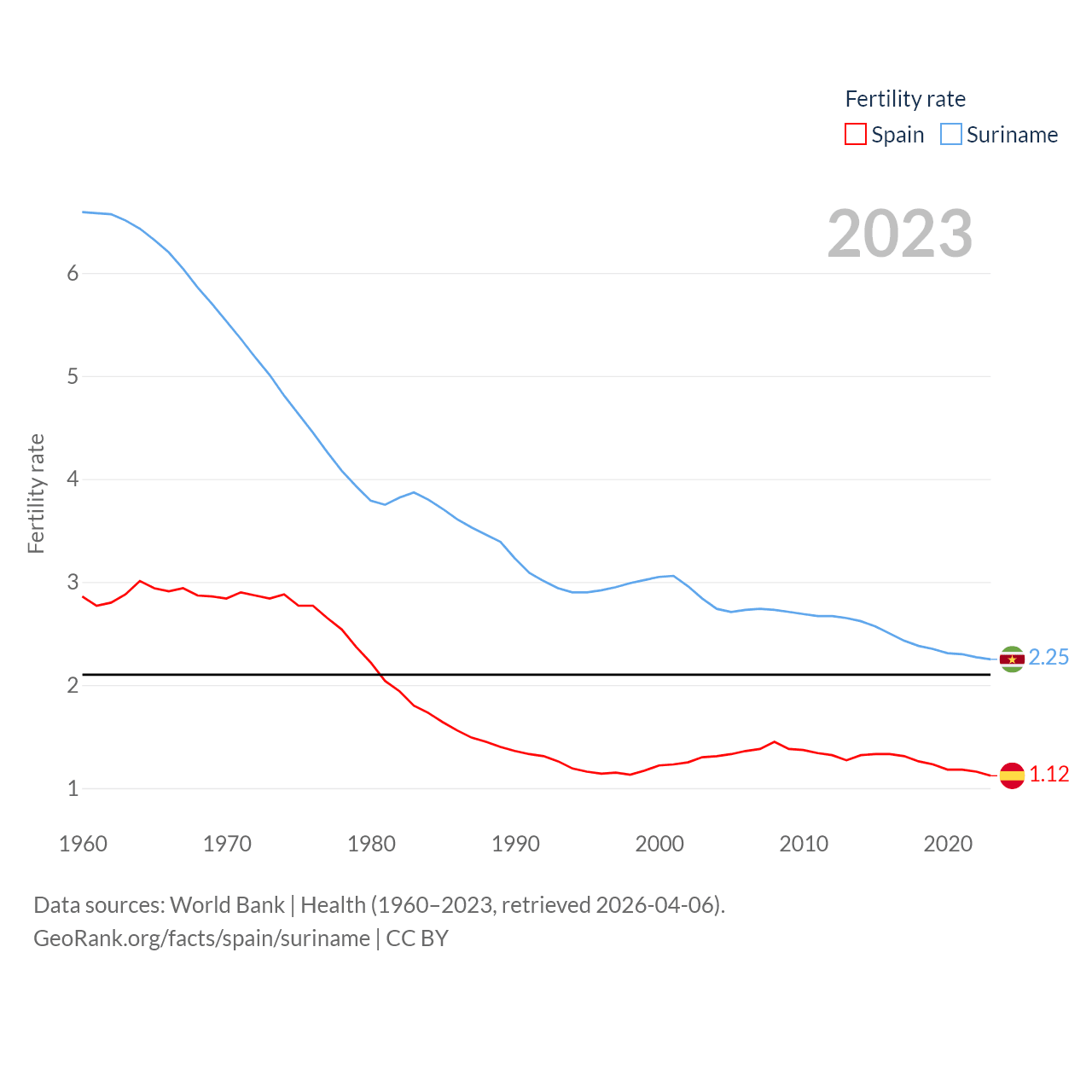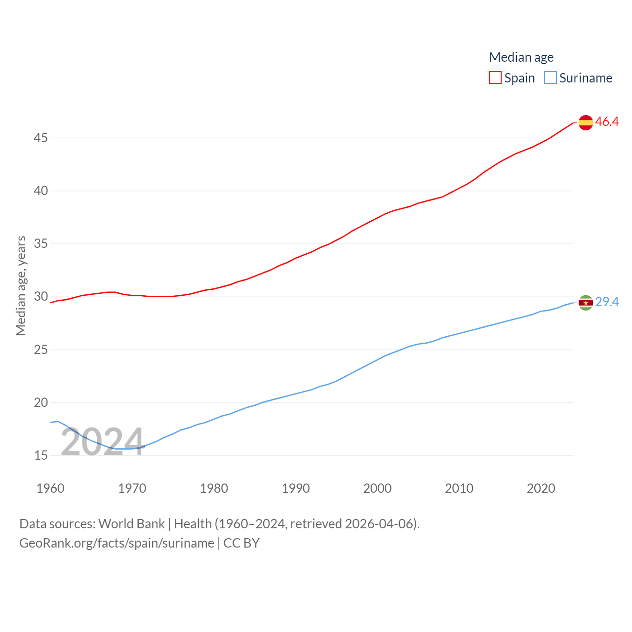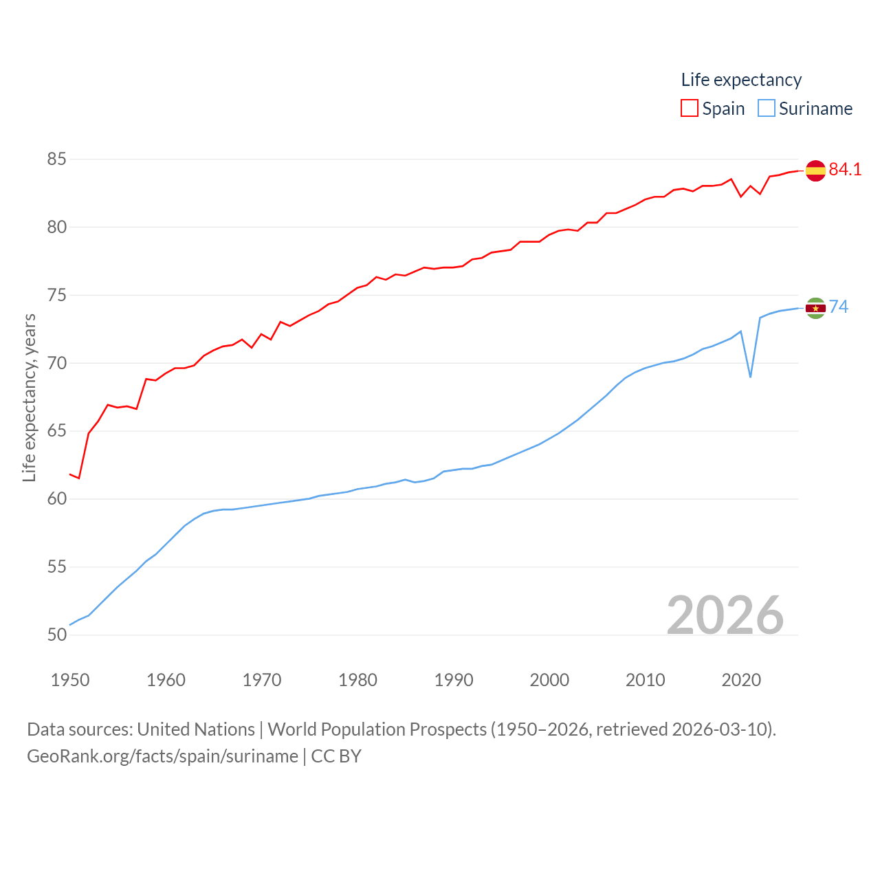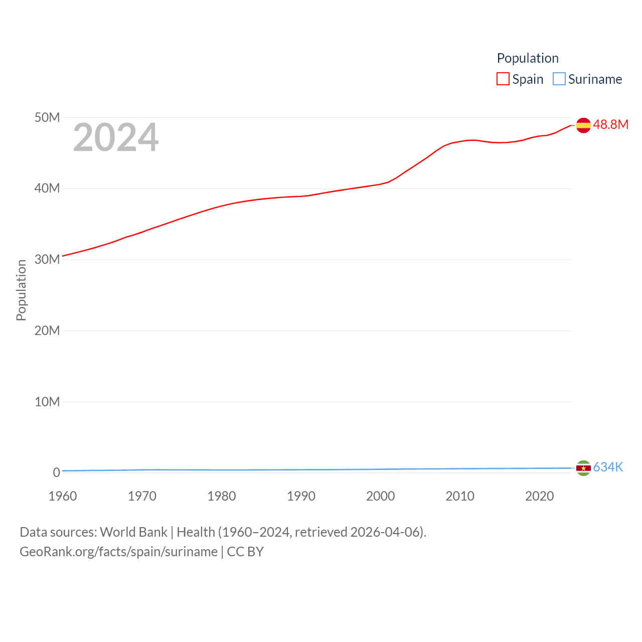 Spain has a population of 48.8M (ranked 32/197), compared with 634K in Suriname (ranked 165/197). Spain's land area is 192,934 sq mi versus 61,972 sq mi for Suriname (ranked 51st vs. 90th).