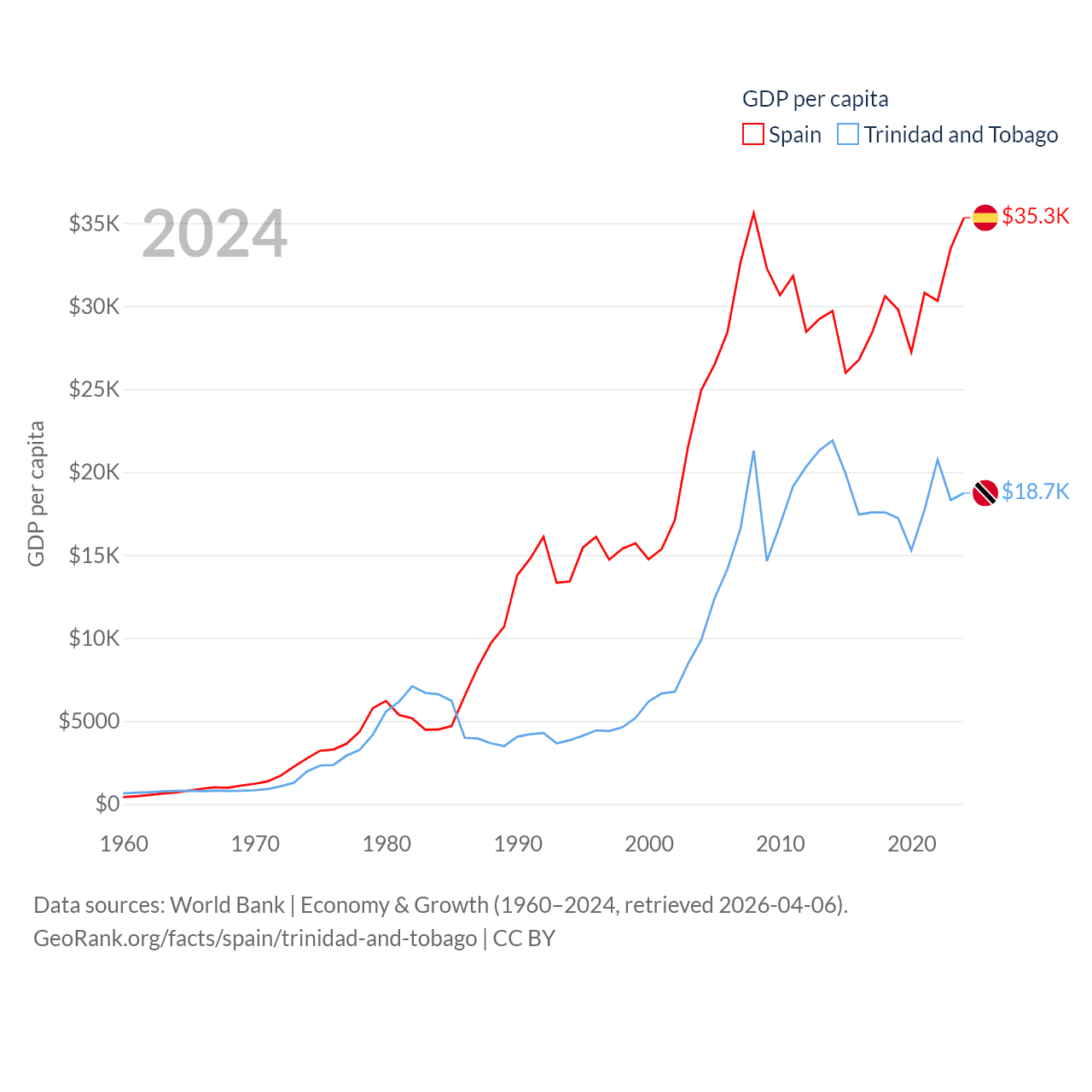 By GDP, Spain ranks 15/197 ($1.73T) and Trinidad and Tobago ranks 115/197 ($25.6B). By GDP per capita, Spain ranks 32/197 ($35,327), while Trinidad and Tobago ranks 61/197 ($18,733).