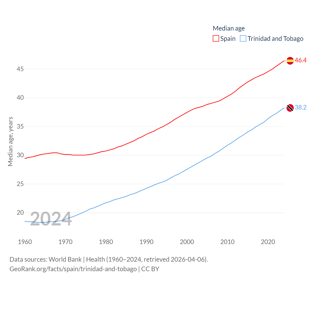 Spain has a population of 48.8M (ranked 32/197), compared with 1.37M in Trinidad and Tobago (ranked 154/197). Spain's land area is 192,934 sq mi versus 1,981 sq mi for Trinidad and Tobago (ranked 51st vs. 166th).