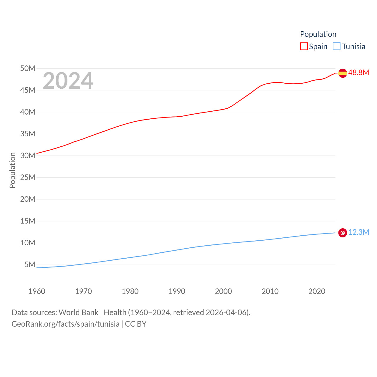Spain has a population of 48.8M (ranked 32/197), compared with 12.3M in Tunisia (ranked 80/197). Spain's land area is 192,934 sq mi versus 59,985 sq mi for Tunisia (ranked 51st vs. 91st).