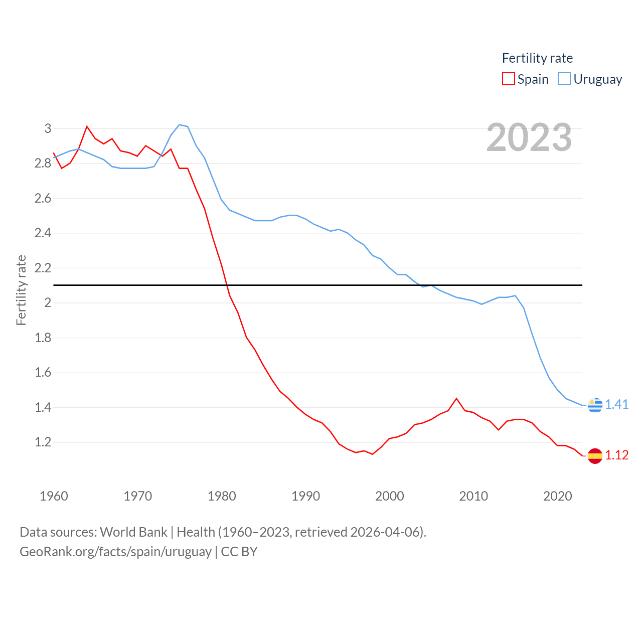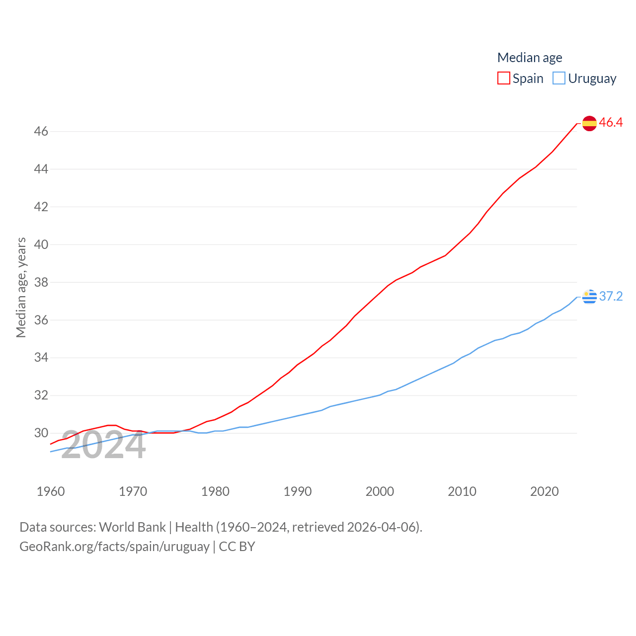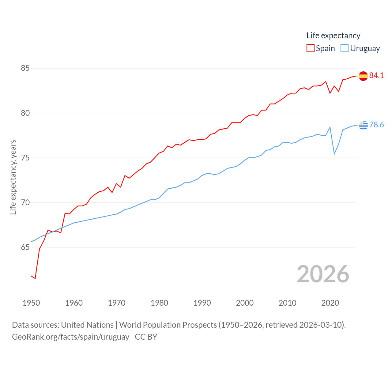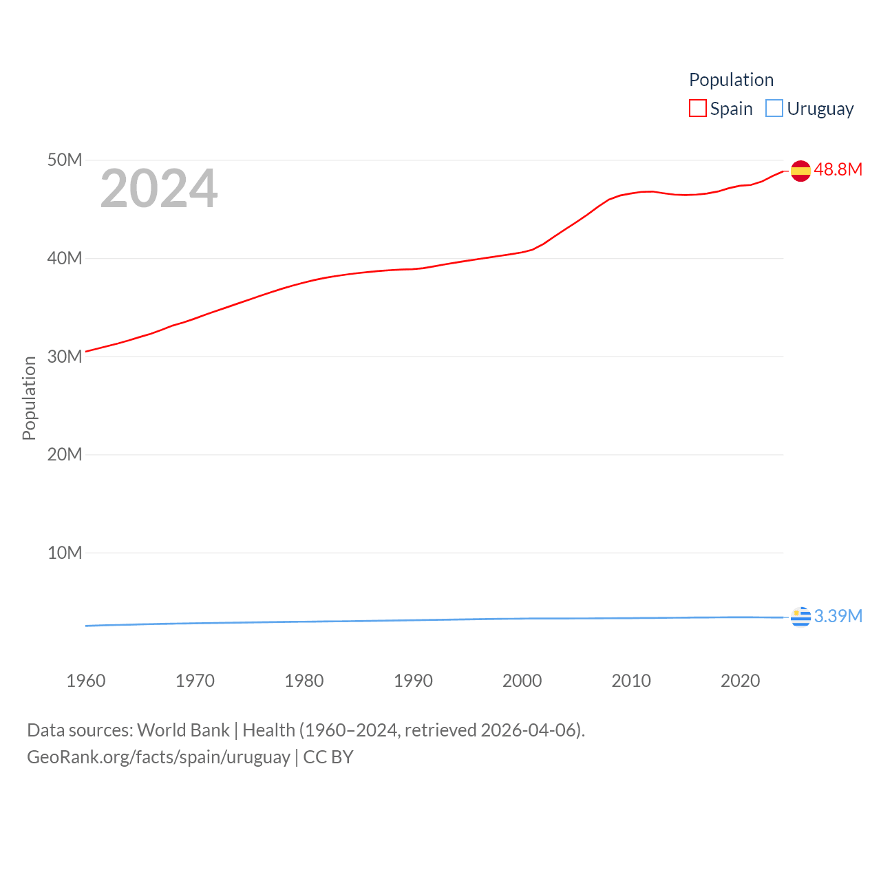 Spain has a population of 48.8M (ranked 32/197), compared with 3.39M in Uruguay (ranked 133/197). Spain's land area is 192,934 sq mi versus 67,576 sq mi for Uruguay (ranked 51st vs. 89th).