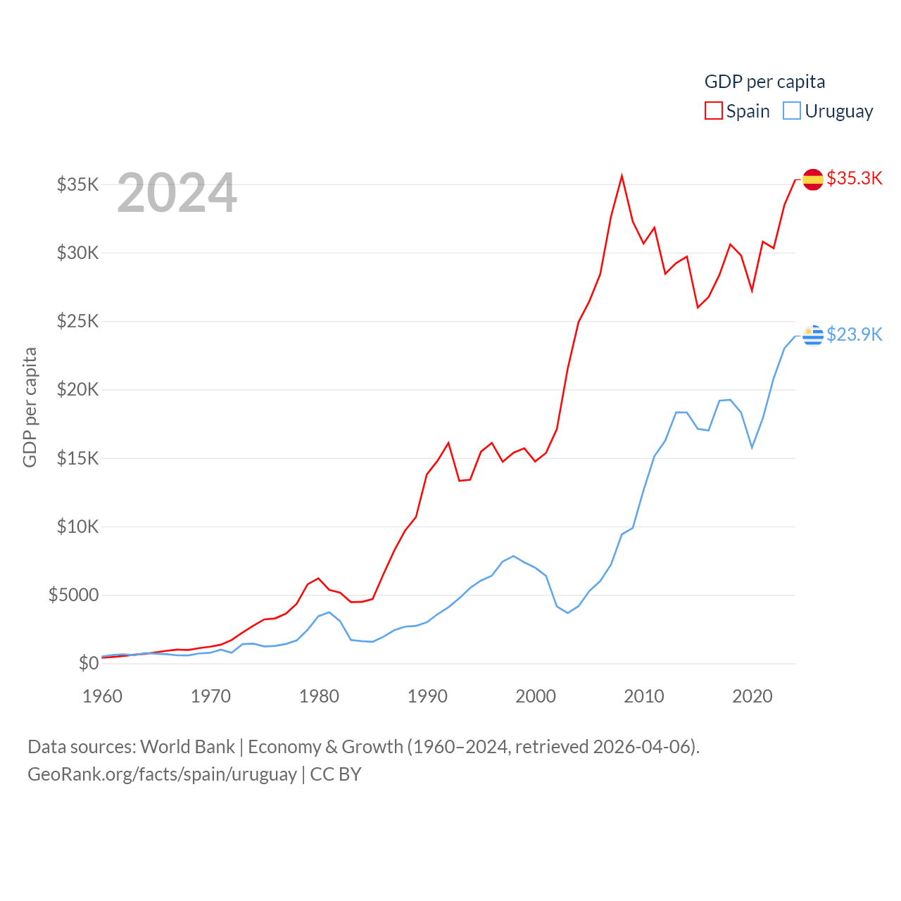 By GDP, Spain ranks 15/197 ($1.73T) and Uruguay ranks 81/197 ($81B). By GDP per capita, Spain ranks 32/197 ($35,327), while Uruguay ranks 52/197 ($23,907).