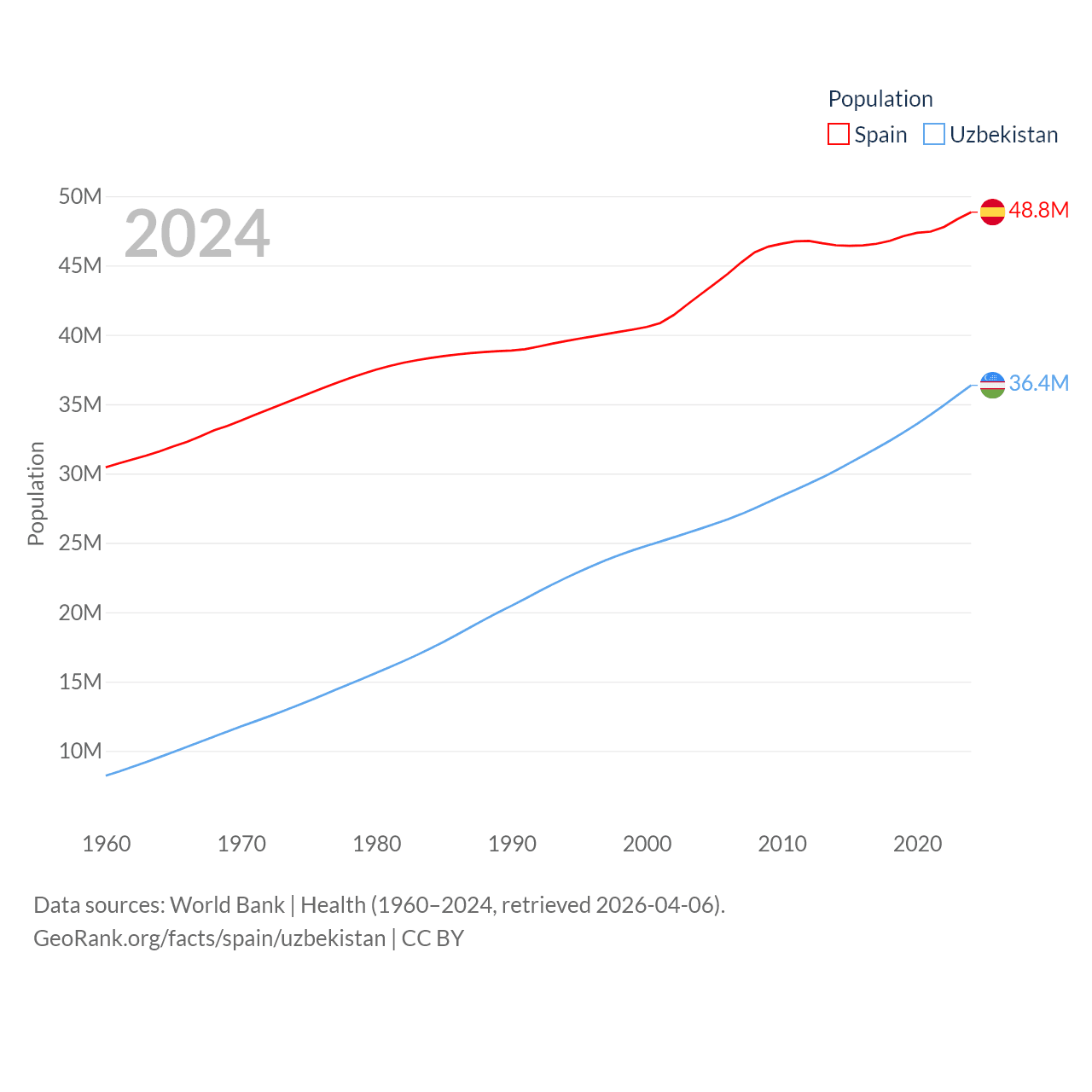 Spain has a population of 48.8M (ranked 32/197), compared with 36.4M in Uzbekistan (ranked 43/197). Spain's land area is 192,934 sq mi versus 170,136 sq mi for Uzbekistan (ranked 51st vs. 56th).