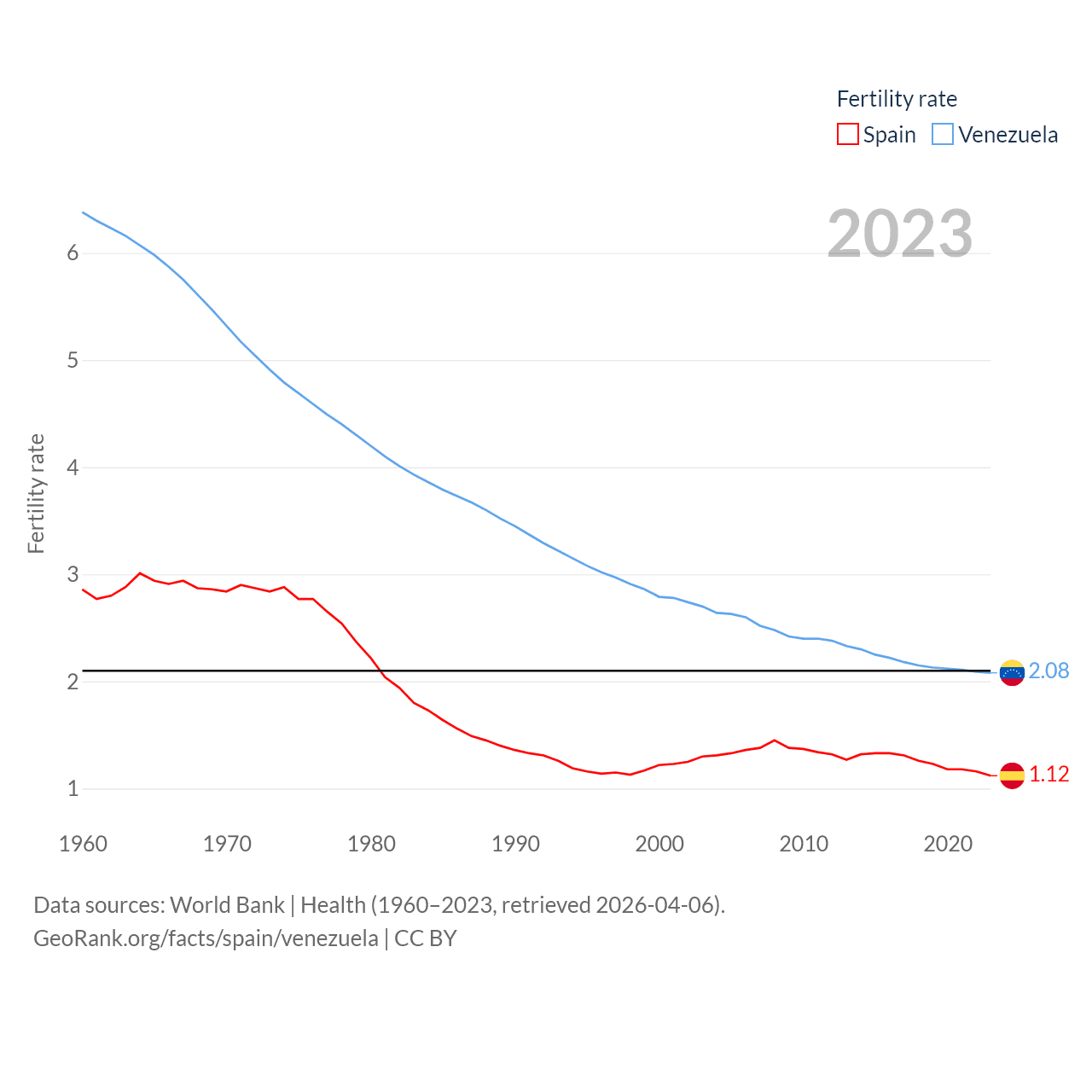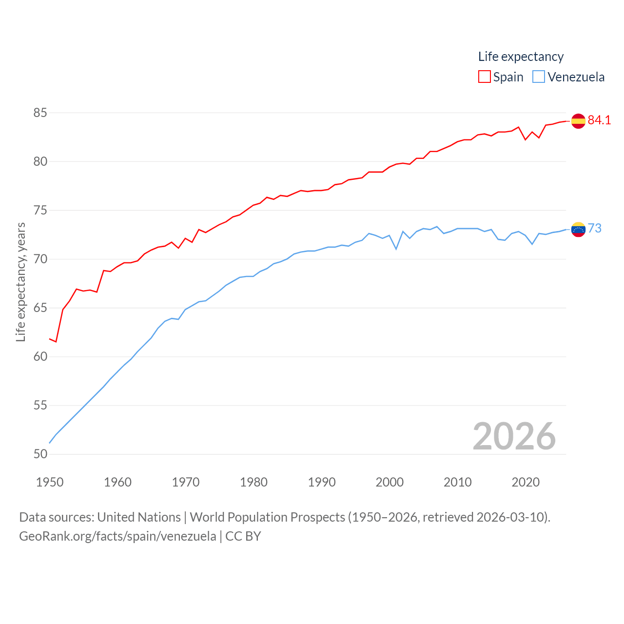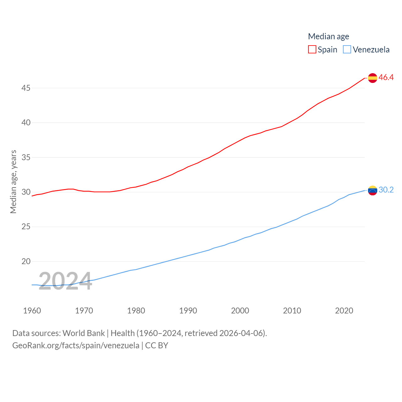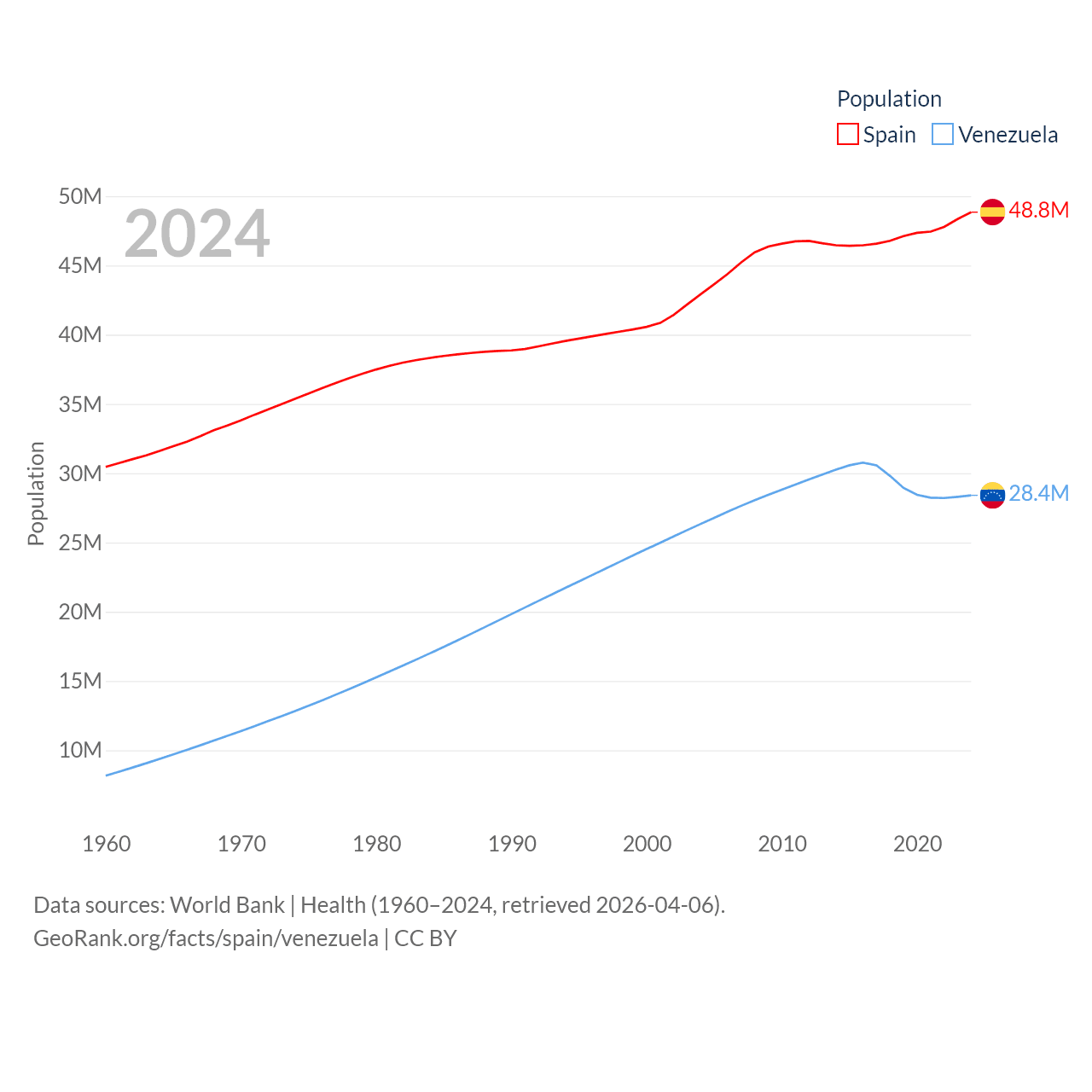 Spain has a population of 48.8M (ranked 32/197), compared with 28.4M in Venezuela (ranked 53/197). Spain's land area is 192,934 sq mi versus 340,561 sq mi for Venezuela (ranked 51st vs. 32nd).