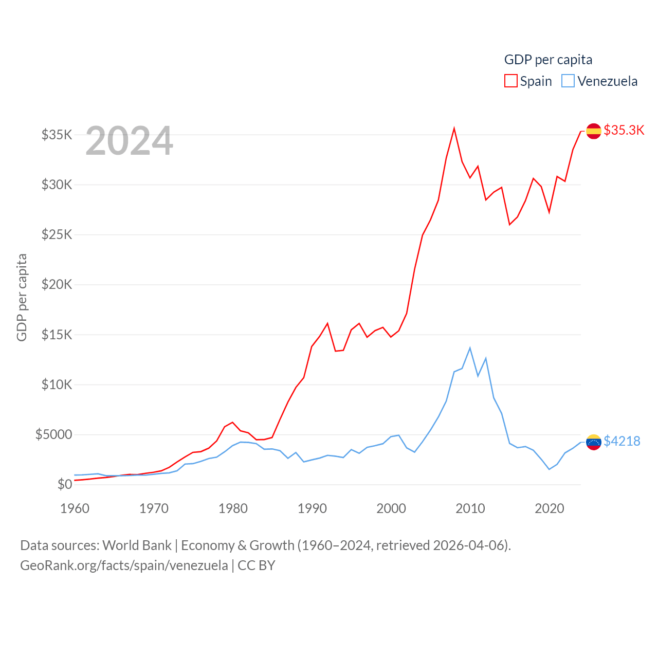 By GDP, Spain ranks 15/197 ($1.73T) and Venezuela ranks 65/197 ($120B). By GDP per capita, Spain ranks 32/197 ($35,327), while Venezuela ranks 128/197 ($4,218).