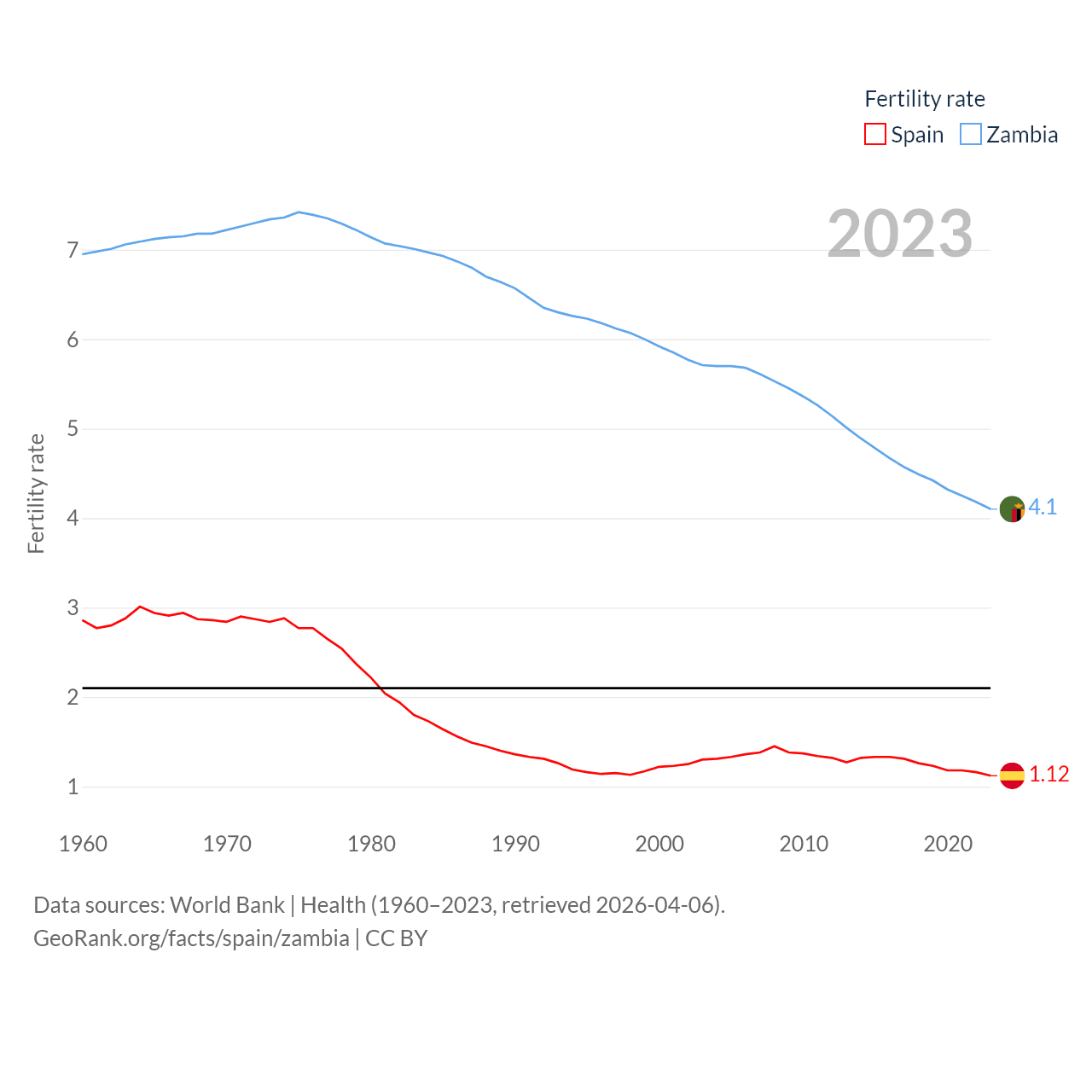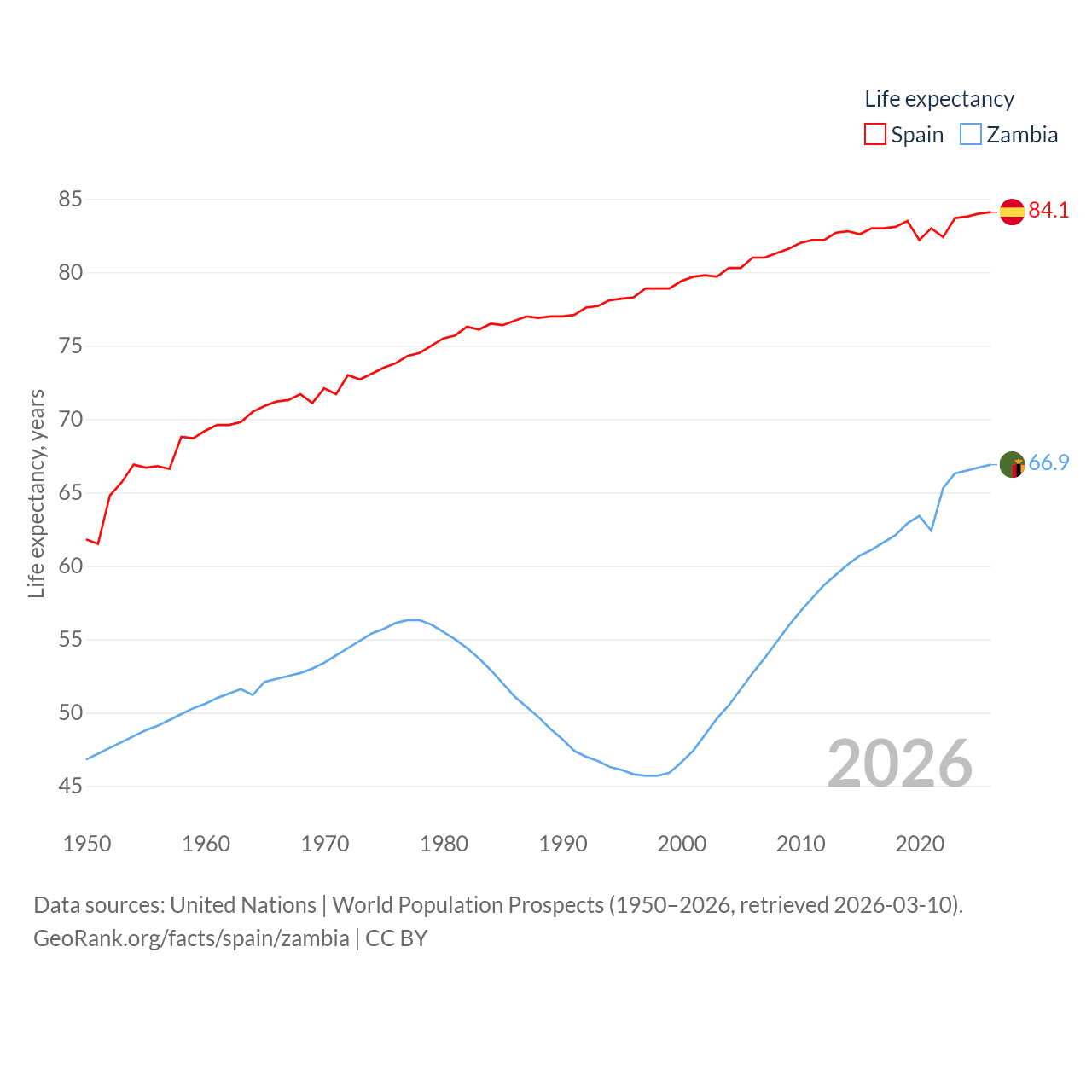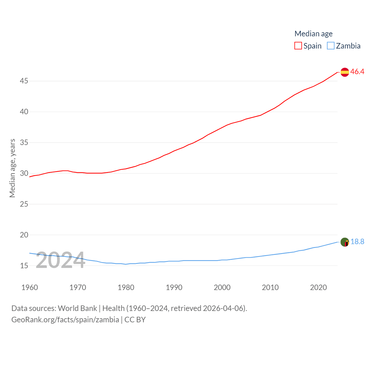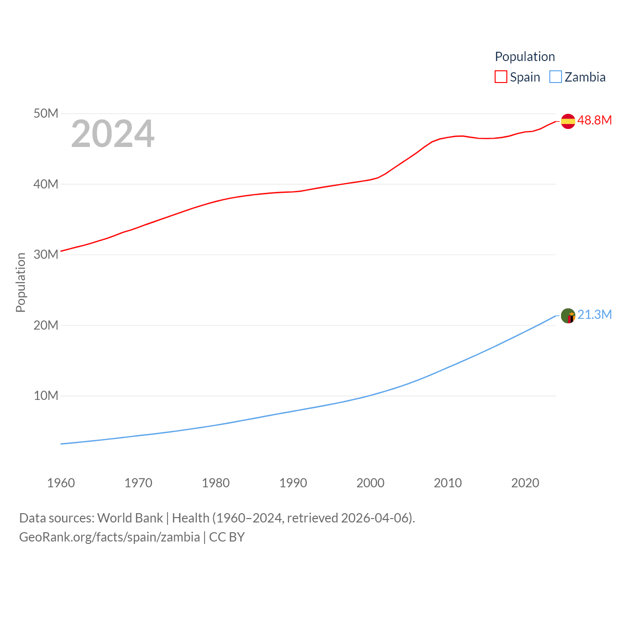 Spain has a population of 48.8M (ranked 32/197), compared with 21.3M in Zambia (ranked 63/197). Spain's land area is 192,934 sq mi versus 287,024 sq mi for Zambia (ranked 51st vs. 37th).