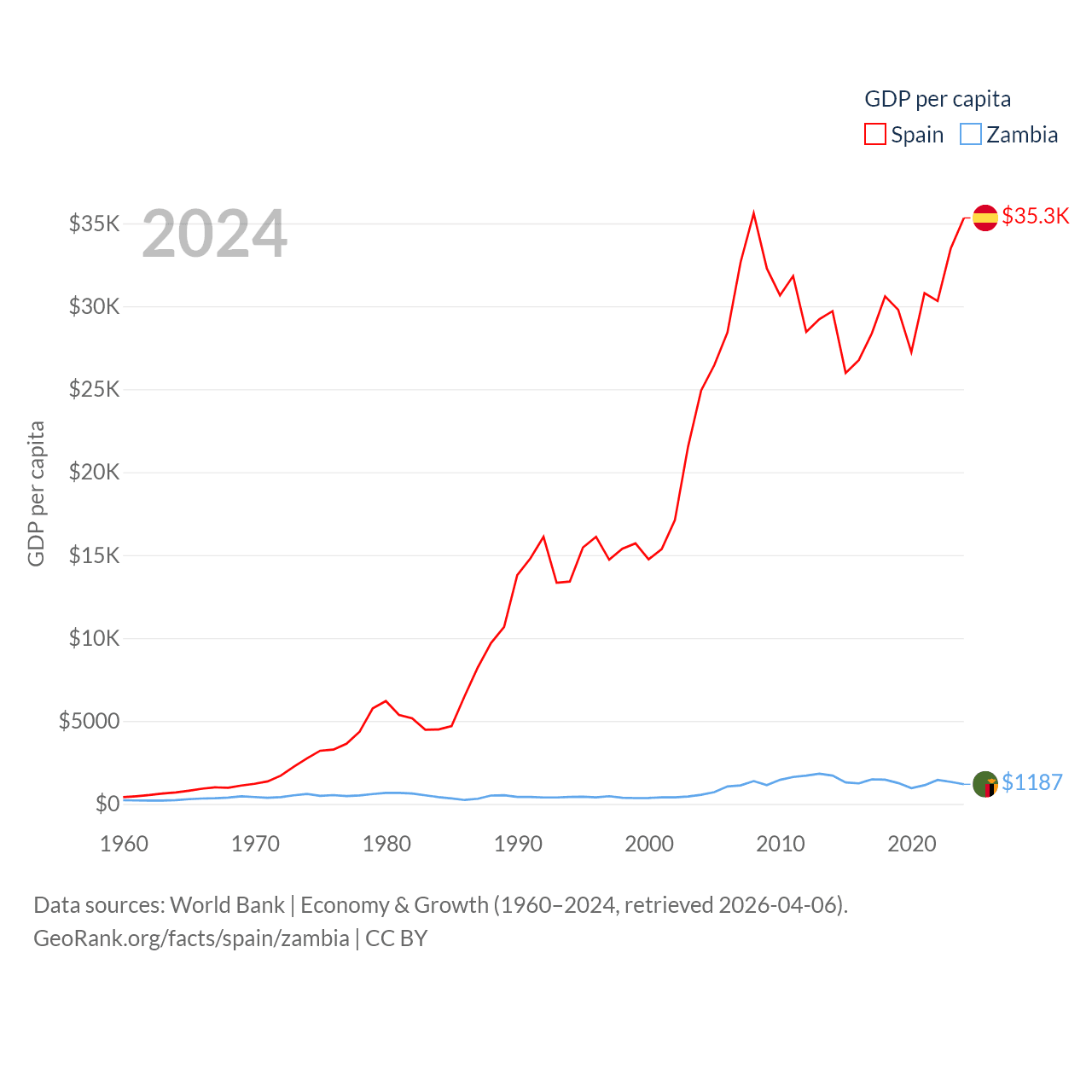 By GDP, Spain ranks 15/197 ($1.73T) and Zambia ranks 116/197 ($25.3B). By GDP per capita, Spain ranks 32/197 ($35,327), while Zambia ranks 169/197 ($1,187).