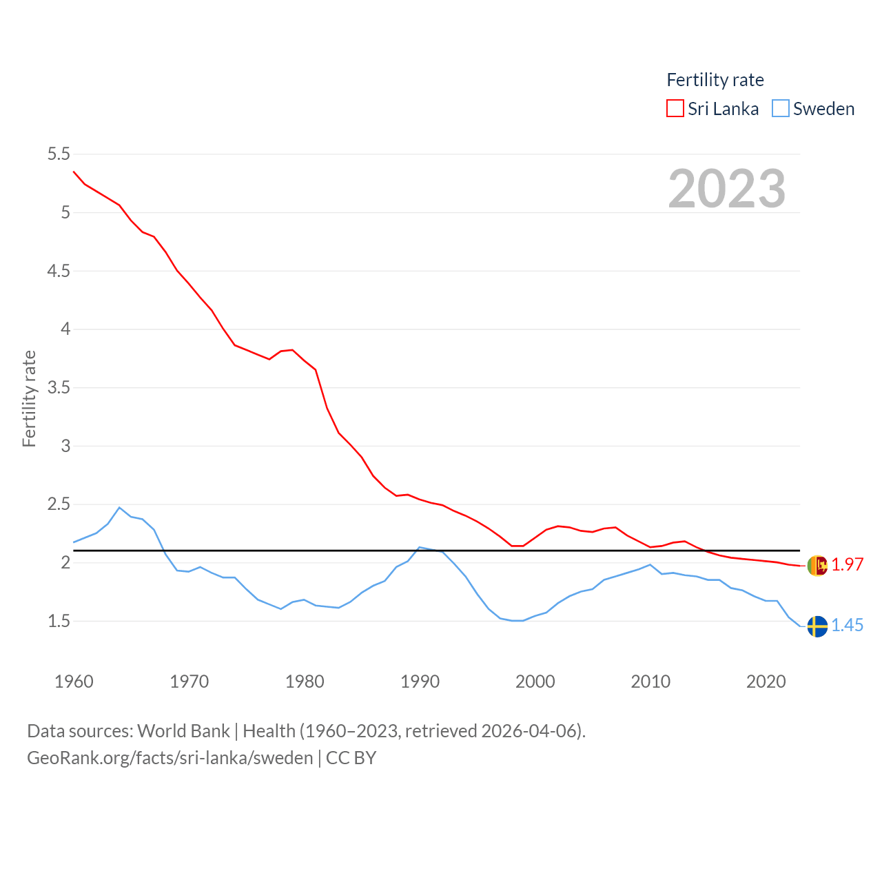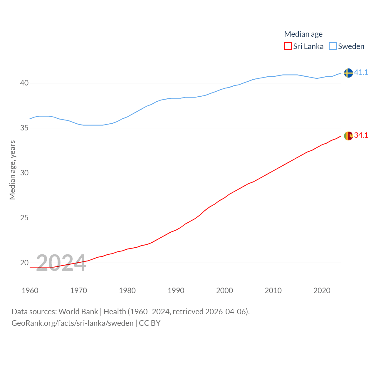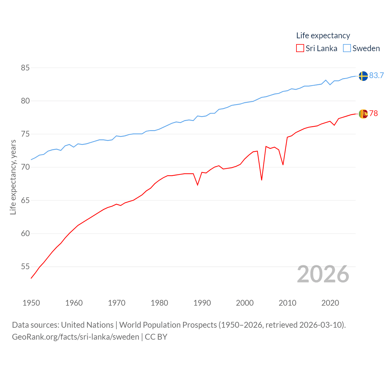 Sri Lanka has a population of 21.9M (ranked 61/197), compared with 10.6M in Sweden (ranked 93/197). Sri Lanka's land area is 23,884 sq mi versus 157,248 sq mi for Sweden (ranked 122nd vs. 58th).