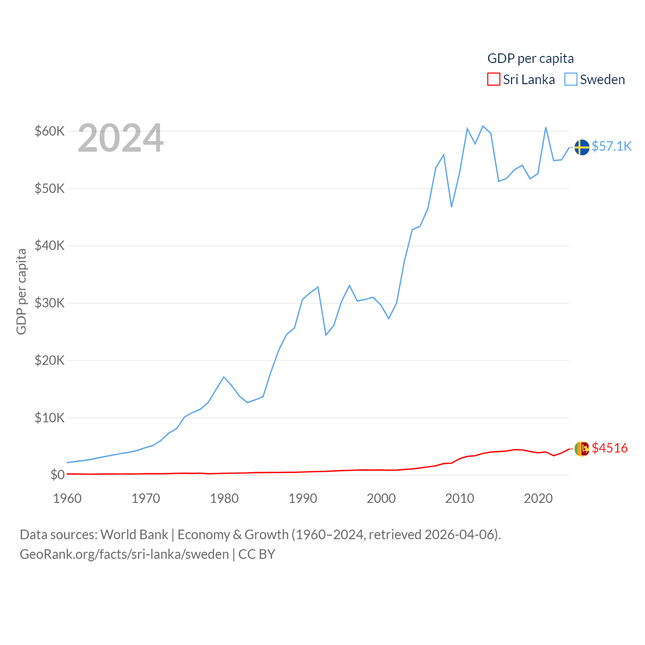 By GDP, Sri Lanka ranks 72/197 ($99B) and Sweden ranks 26/197 ($604B). By GDP per capita, Sri Lanka ranks 124/197 ($4,516), while Sweden ranks 17/197 ($57,117).