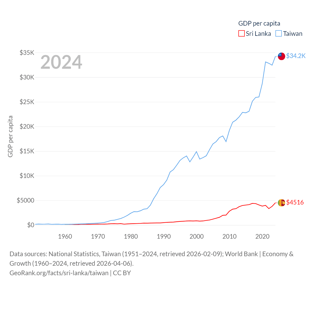 By GDP, Sri Lanka ranks 72/197 ($99B) and Taiwan ranks 22/197 ($802B). By GDP per capita, Sri Lanka ranks 124/197 ($4,516), while Taiwan ranks 35/197 ($34,238).