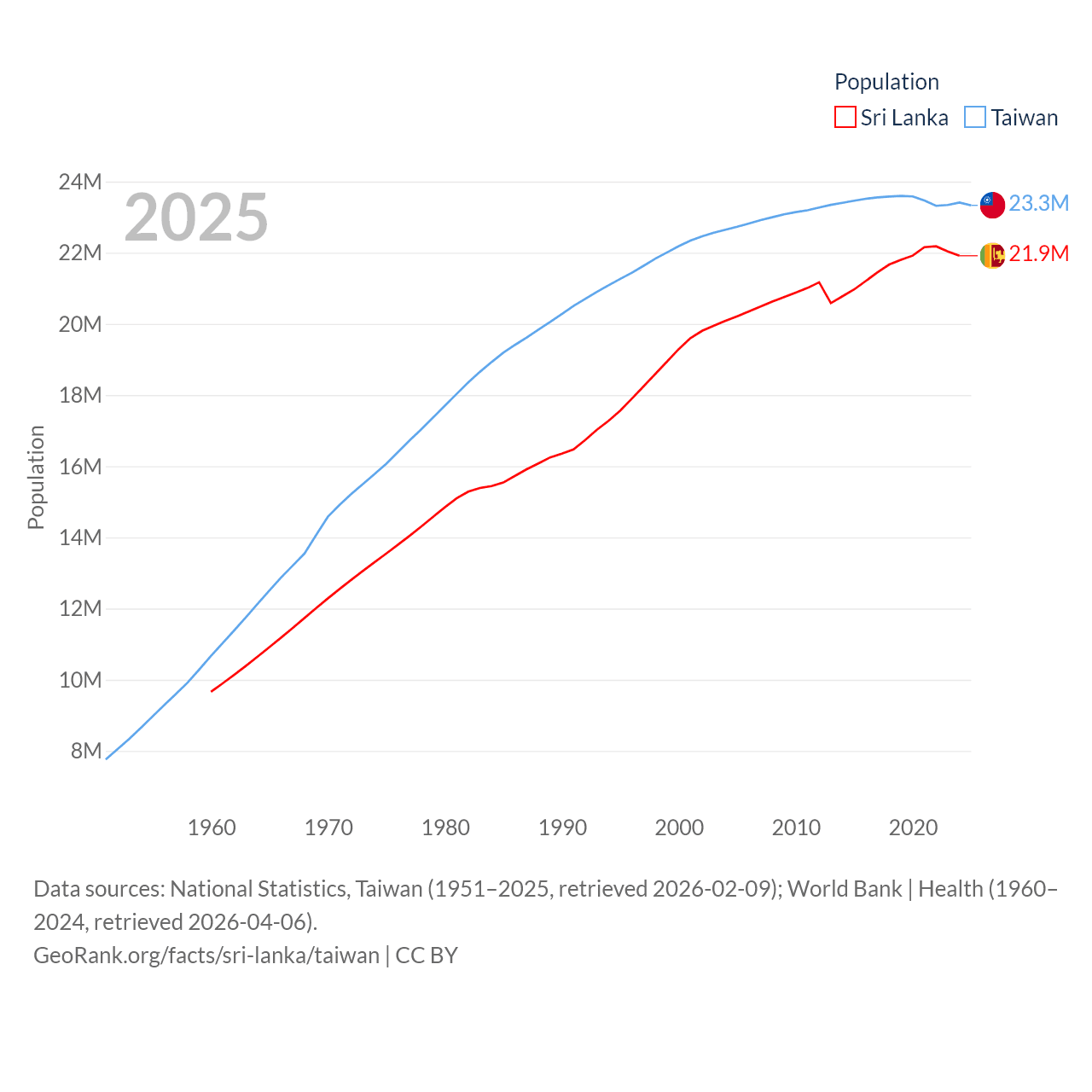 Sri Lanka has a population of 21.9M (ranked 61/197), compared with 23.3M in Taiwan (ranked 60/197). Sri Lanka's land area is 23,884 sq mi versus 13,976 sq mi for Taiwan (ranked 122nd vs. 133rd).