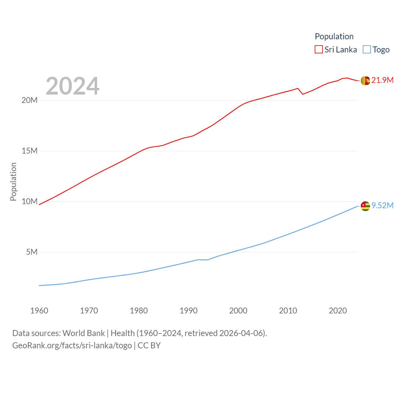 Sri Lanka has a population of 21.9M (ranked 61/197), compared with 9.52M in Togo (ranked 98/197). Sri Lanka's land area is 23,884 sq mi versus 21,000 sq mi for Togo (ranked 122nd vs. 124th).