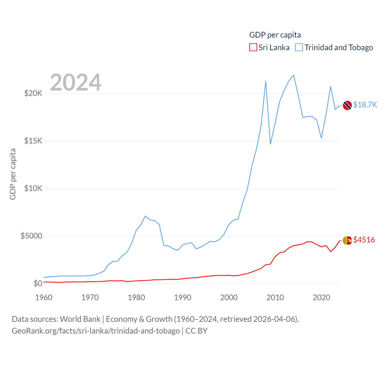By GDP, Sri Lanka ranks 72/197 ($99B) and Trinidad and Tobago ranks 115/197 ($25.6B). By GDP per capita, Sri Lanka ranks 124/197 ($4,516), while Trinidad and Tobago ranks 61/197 ($18,733).