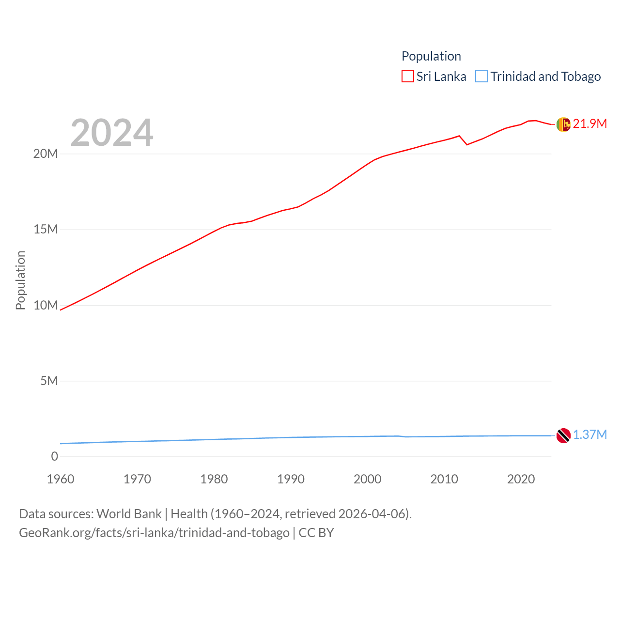 Sri Lanka has a population of 21.9M (ranked 61/197), compared with 1.37M in Trinidad and Tobago (ranked 154/197). Sri Lanka's land area is 23,884 sq mi versus 1,981 sq mi for Trinidad and Tobago (ranked 122nd vs. 166th).