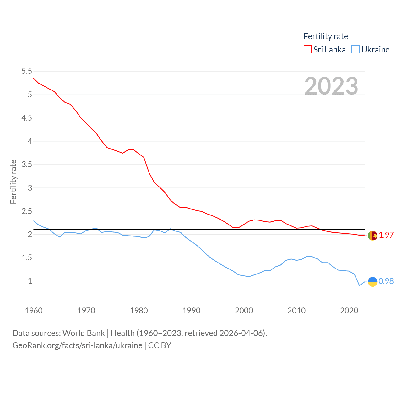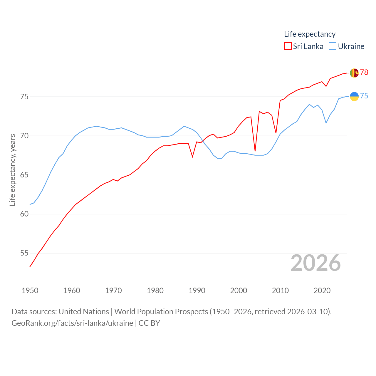 Sri Lanka has a population of 21.9M (ranked 61/197), compared with 37.9M in Ukraine (ranked 41/197). Sri Lanka's land area is 23,884 sq mi versus 223,708 sq mi for Ukraine (ranked 122nd vs. 46th).