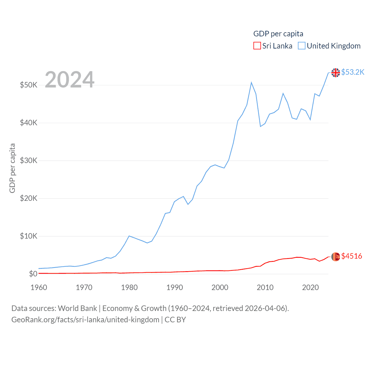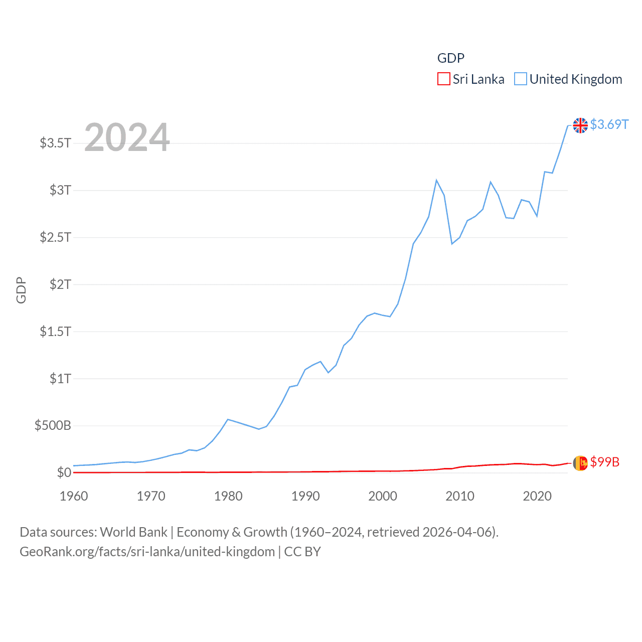 By GDP, Sri Lanka ranks 72/197 ($99B) and The United Kingdom ranks 6/197 ($3.69T). By GDP per capita, Sri Lanka ranks 124/197 ($4,516), while The United Kingdom ranks 22/197 ($53,246).
