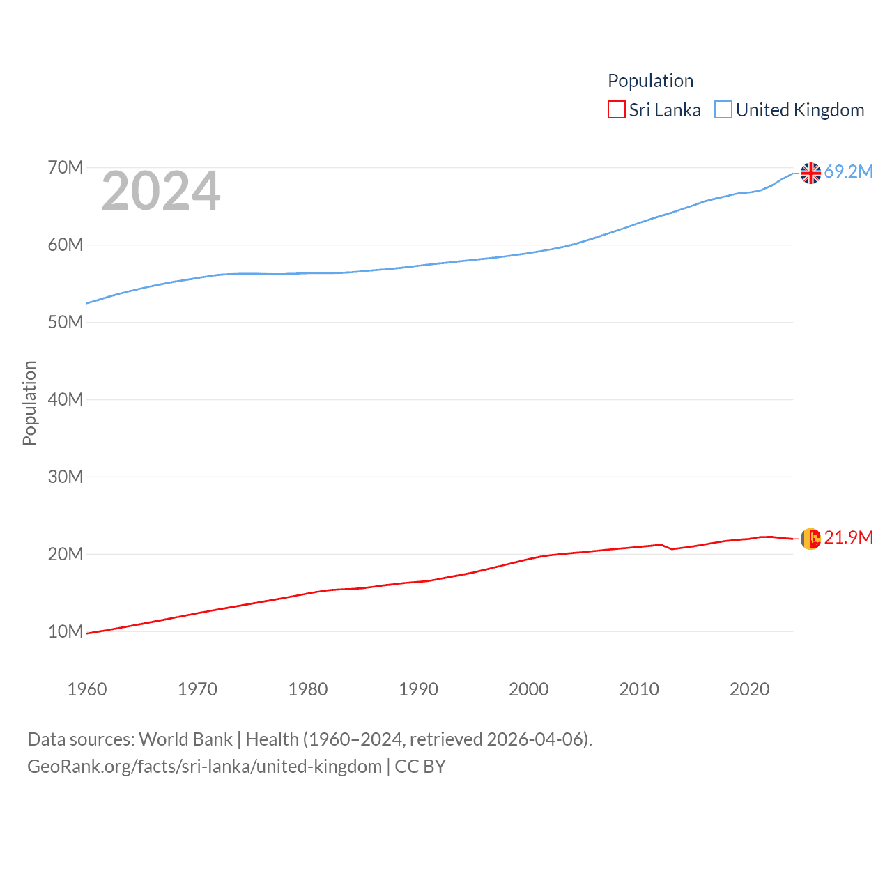 Sri Lanka has a population of 21.9M (ranked 61/197), compared with 69.2M in The United Kingdom (ranked 21/197). Sri Lanka's land area is 23,884 sq mi versus 93,410 sq mi for The United Kingdom (ranked 122nd vs. 78th).