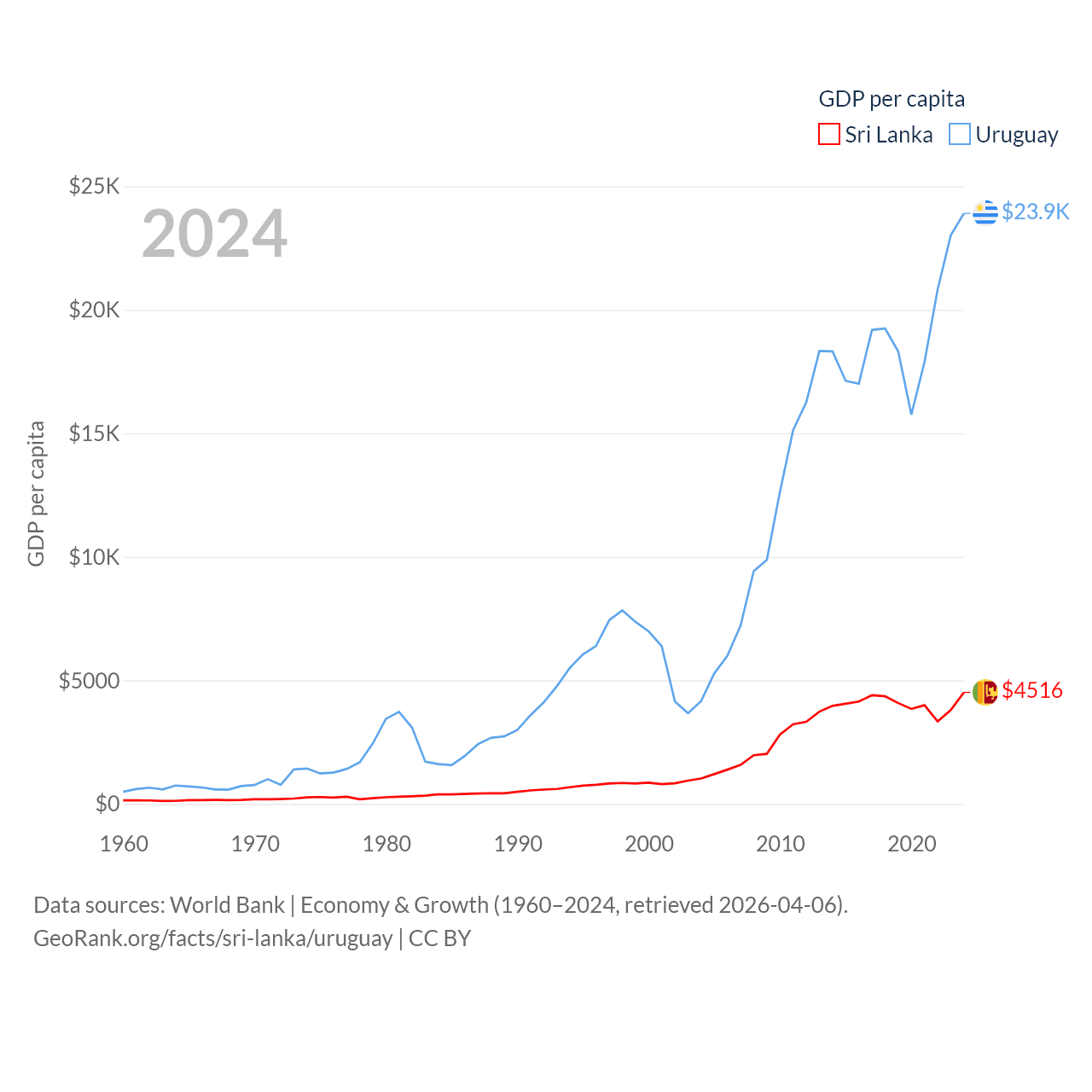 By GDP, Sri Lanka ranks 72/197 ($99B) and Uruguay ranks 81/197 ($81B). By GDP per capita, Sri Lanka ranks 124/197 ($4,516), while Uruguay ranks 52/197 ($23,907).