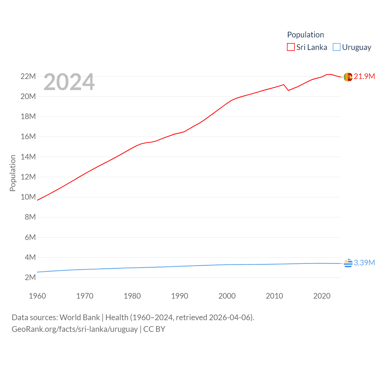 Sri Lanka has a population of 21.9M (ranked 61/197), compared with 3.39M in Uruguay (ranked 133/197). Sri Lanka's land area is 23,884 sq mi versus 67,576 sq mi for Uruguay (ranked 122nd vs. 89th).