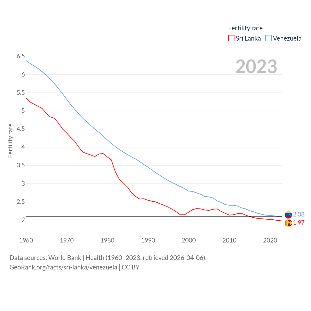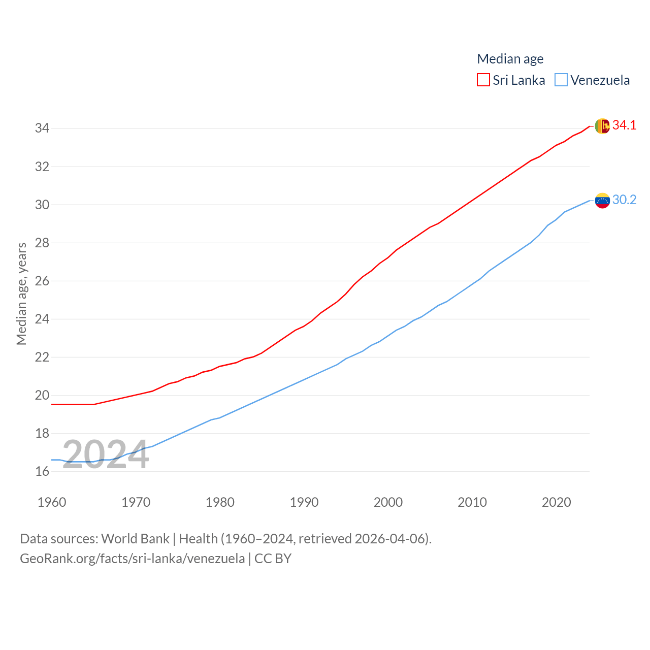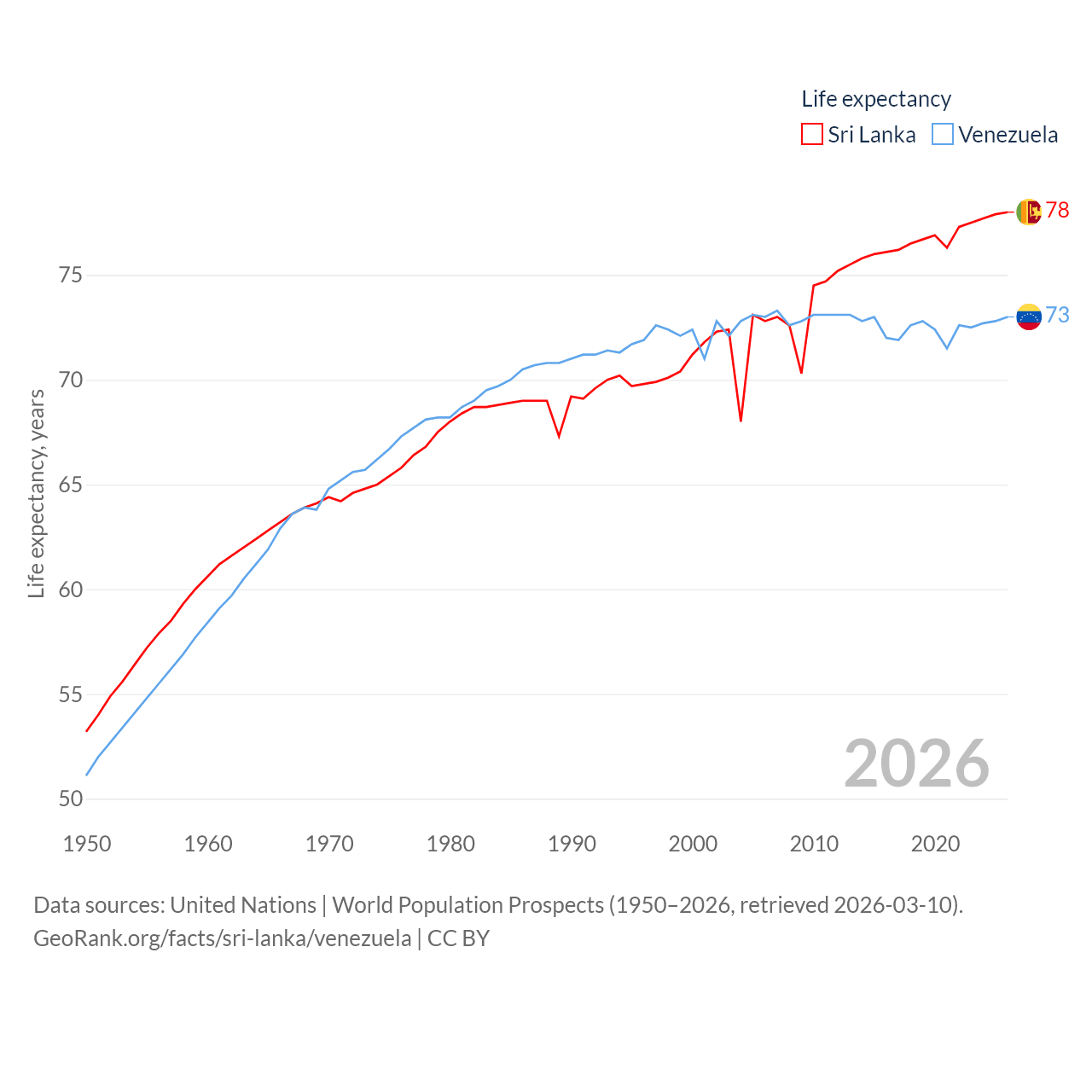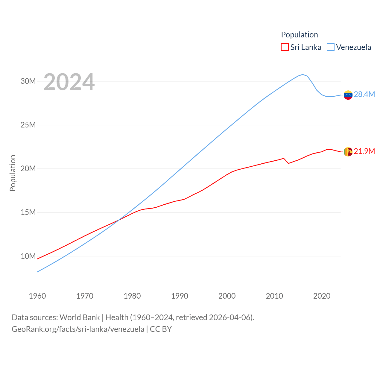 Sri Lanka has a population of 21.9M (ranked 61/197), compared with 28.4M in Venezuela (ranked 53/197). Sri Lanka's land area is 23,884 sq mi versus 340,561 sq mi for Venezuela (ranked 122nd vs. 32nd).