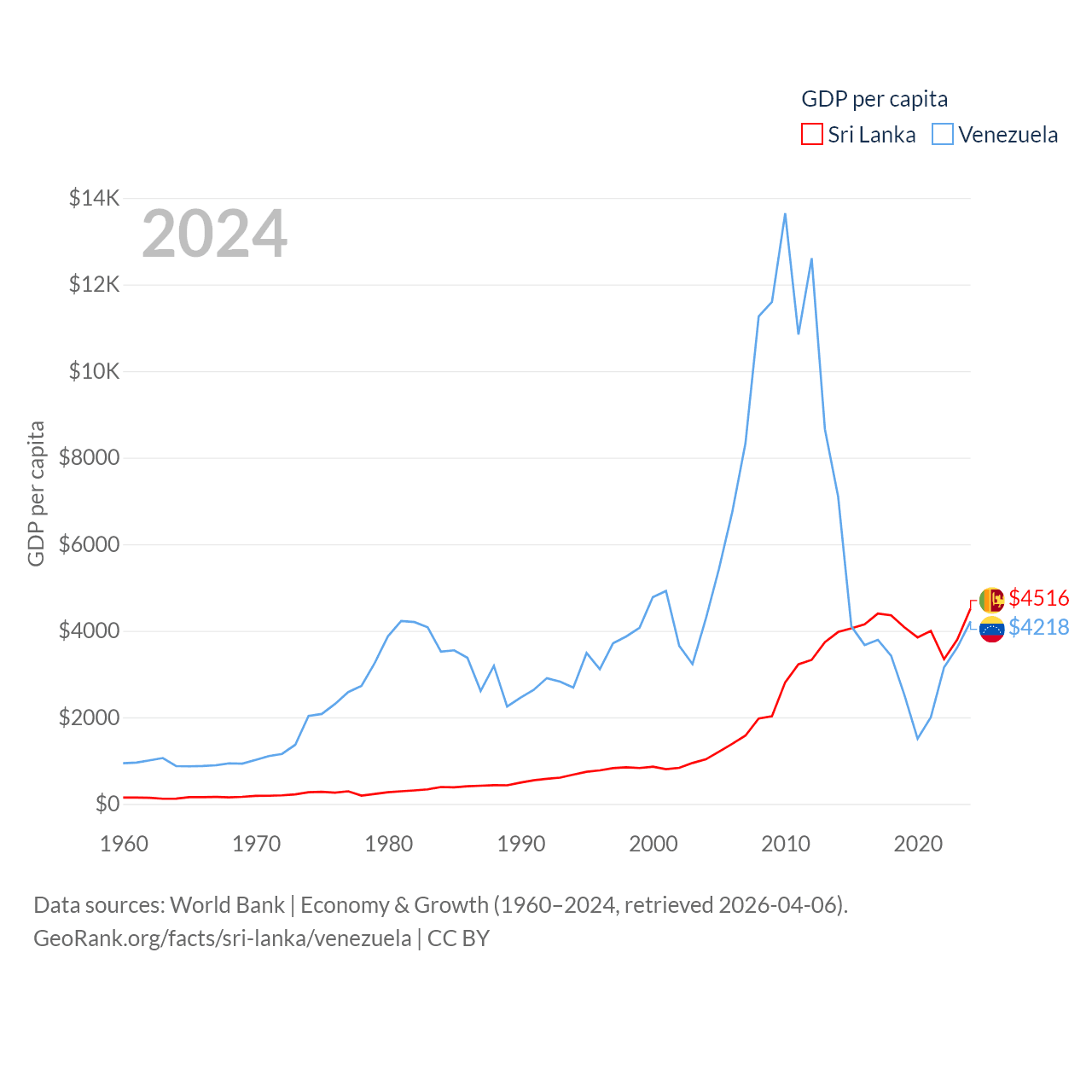 By GDP, Sri Lanka ranks 72/197 ($99B) and Venezuela ranks 65/197 ($120B). By GDP per capita, Sri Lanka ranks 124/197 ($4,516), while Venezuela ranks 128/197 ($4,218).
