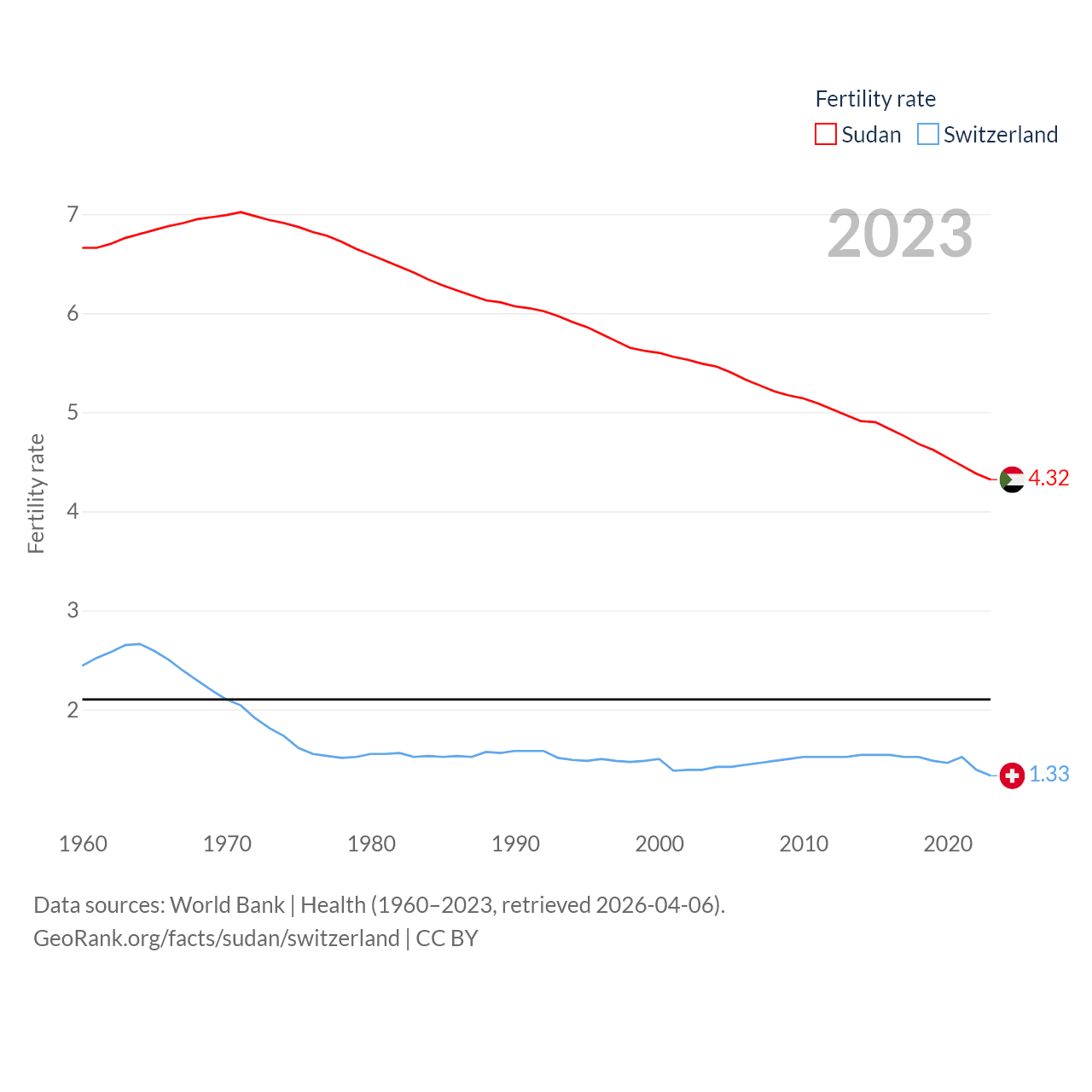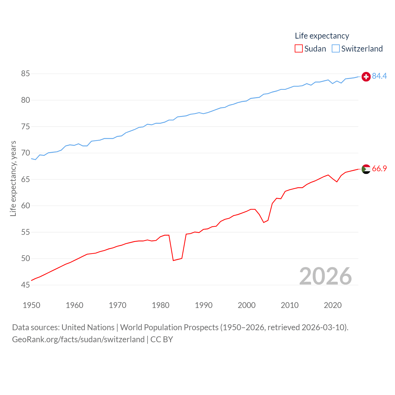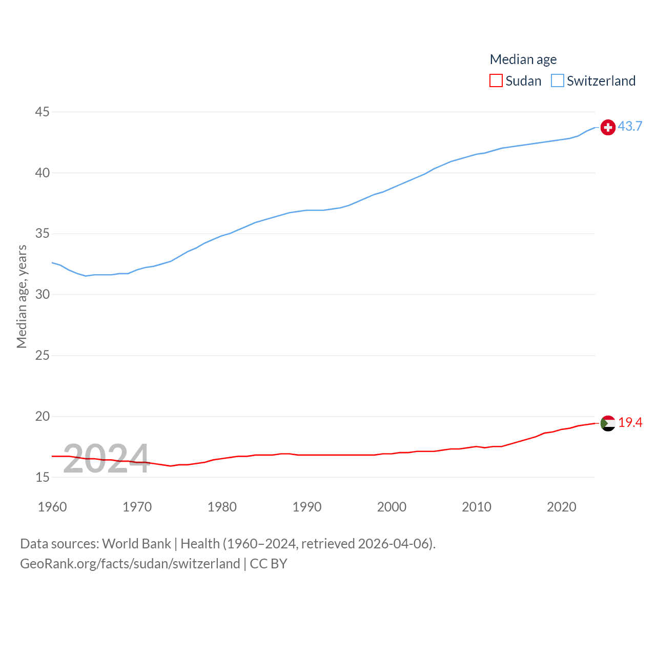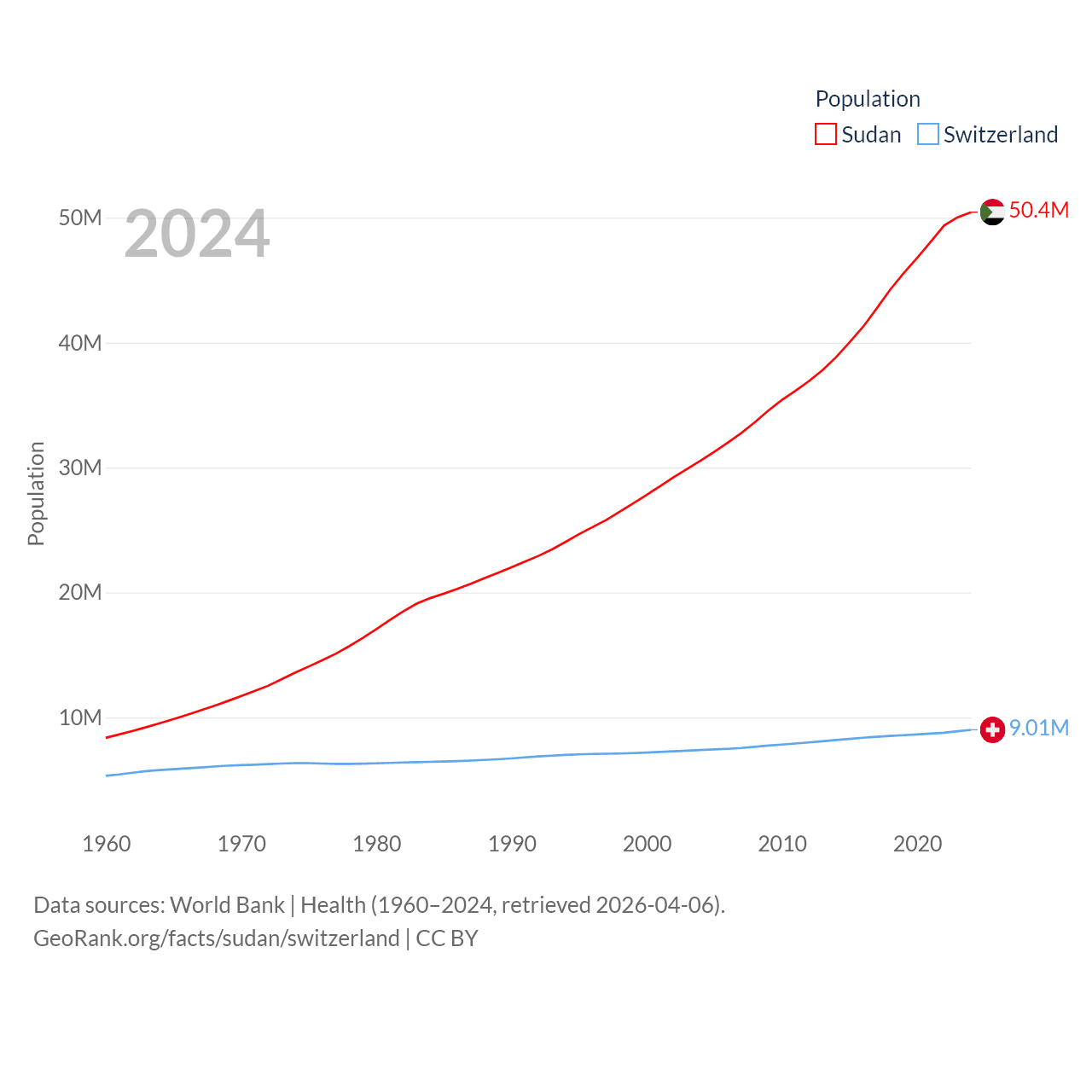 Sudan has a population of 50.4M (ranked 30/197), compared with 9.01M in Switzerland (ranked 101/197). Sudan's land area is 721,239 sq mi versus 15,255 sq mi for Switzerland (ranked 15th vs. 131st).