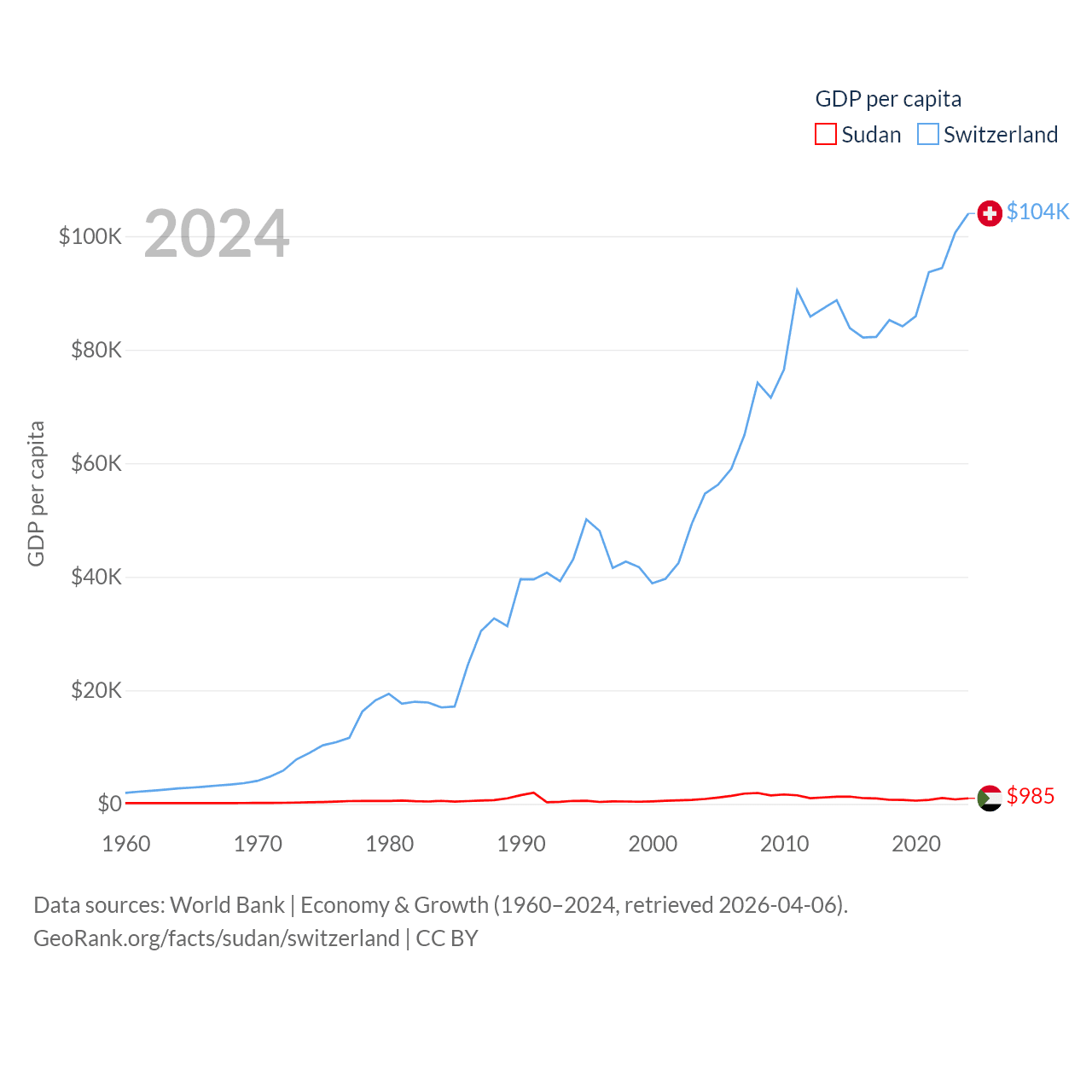 By GDP, Sudan ranks 94/197 ($49.7B) and Switzerland ranks 20/197 ($937B). By GDP per capita, Sudan ranks 179/197 ($985), while Switzerland ranks 5/197 ($103,998).