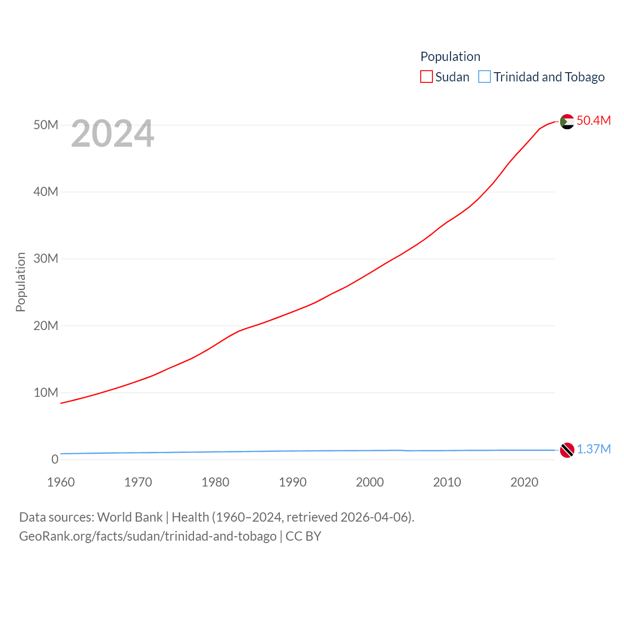 Sudan has a population of 50.4M (ranked 30/197), compared with 1.37M in Trinidad and Tobago (ranked 154/197). Sudan's land area is 721,239 sq mi versus 1,981 sq mi for Trinidad and Tobago (ranked 15th vs. 166th).
