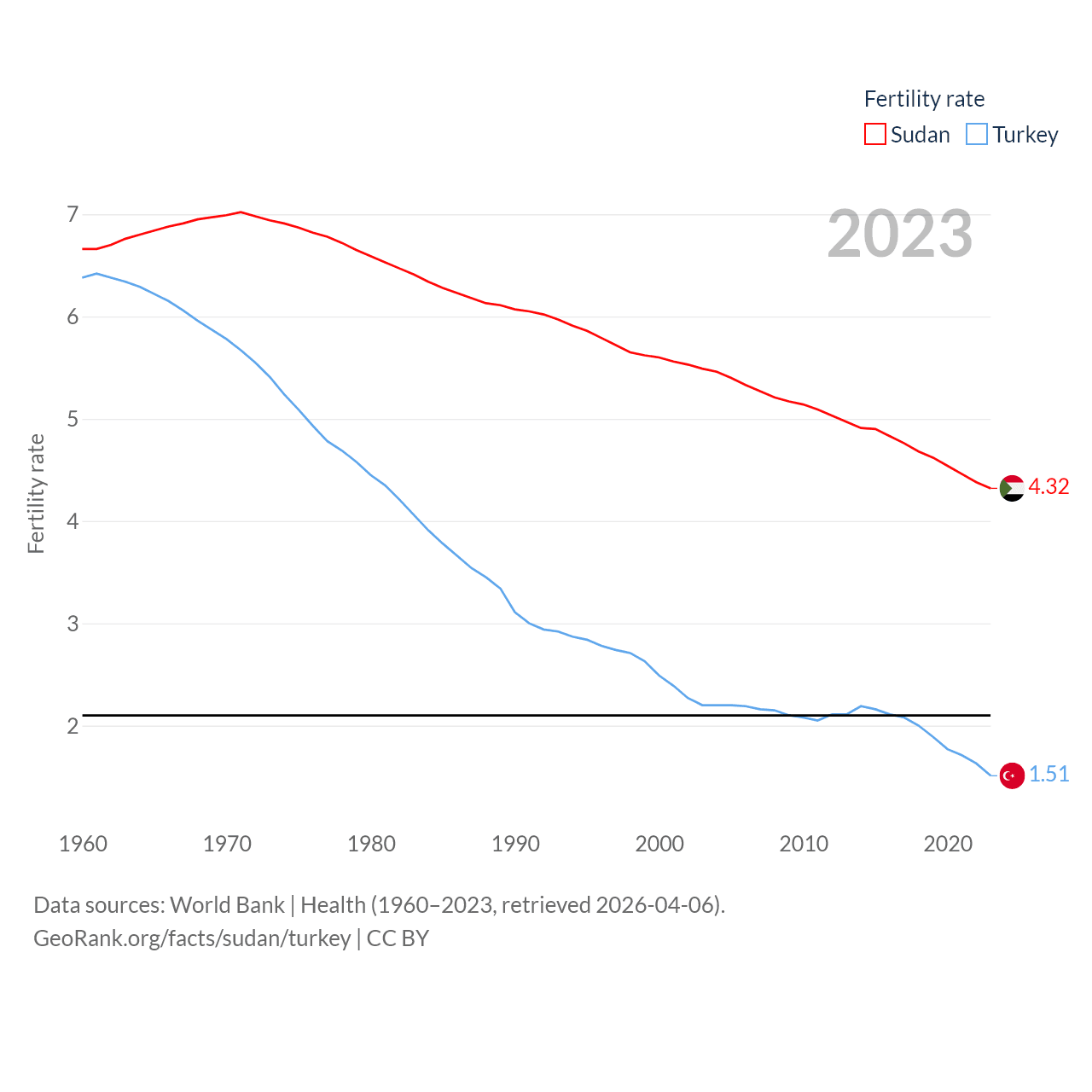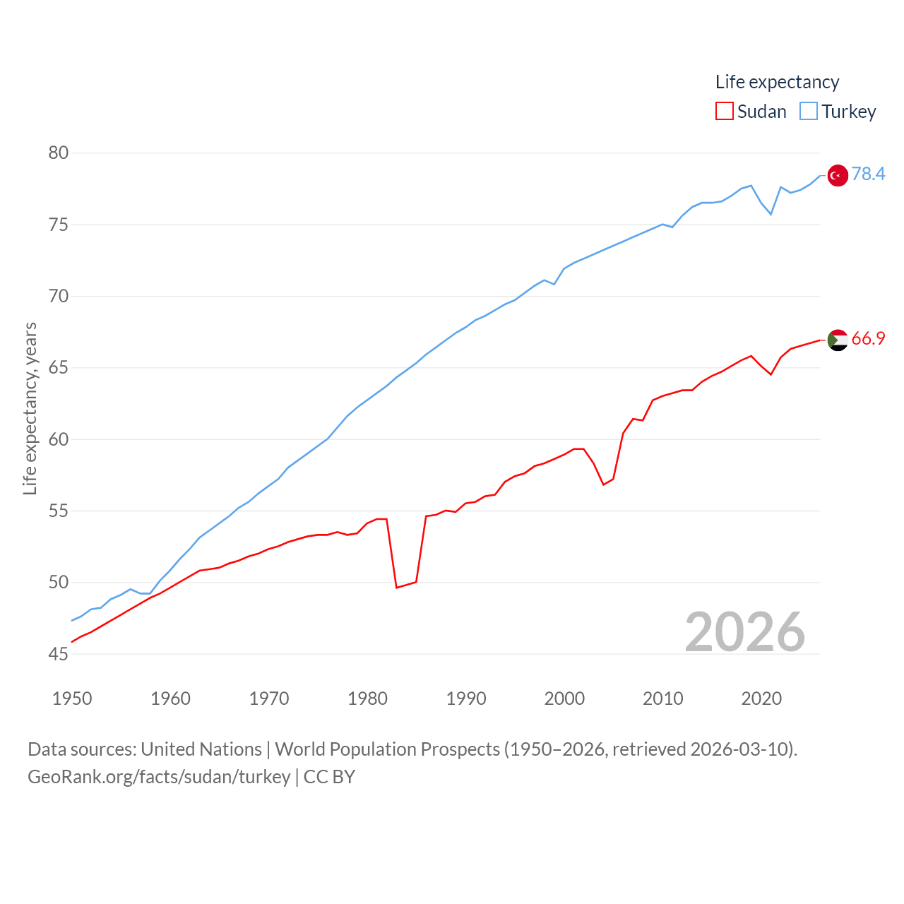 Sudan has a population of 50.4M (ranked 30/197), compared with 85.5M in Turkey (ranked 18/197). Sudan's land area is 721,239 sq mi versus 297,156 sq mi for Turkey (ranked 15th vs. 36th).