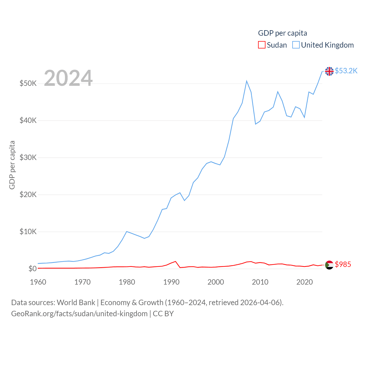 By GDP, Sudan ranks 94/197 ($49.7B) and The United Kingdom ranks 6/197 ($3.69T). By GDP per capita, Sudan ranks 179/197 ($985), while The United Kingdom ranks 22/197 ($53,246).