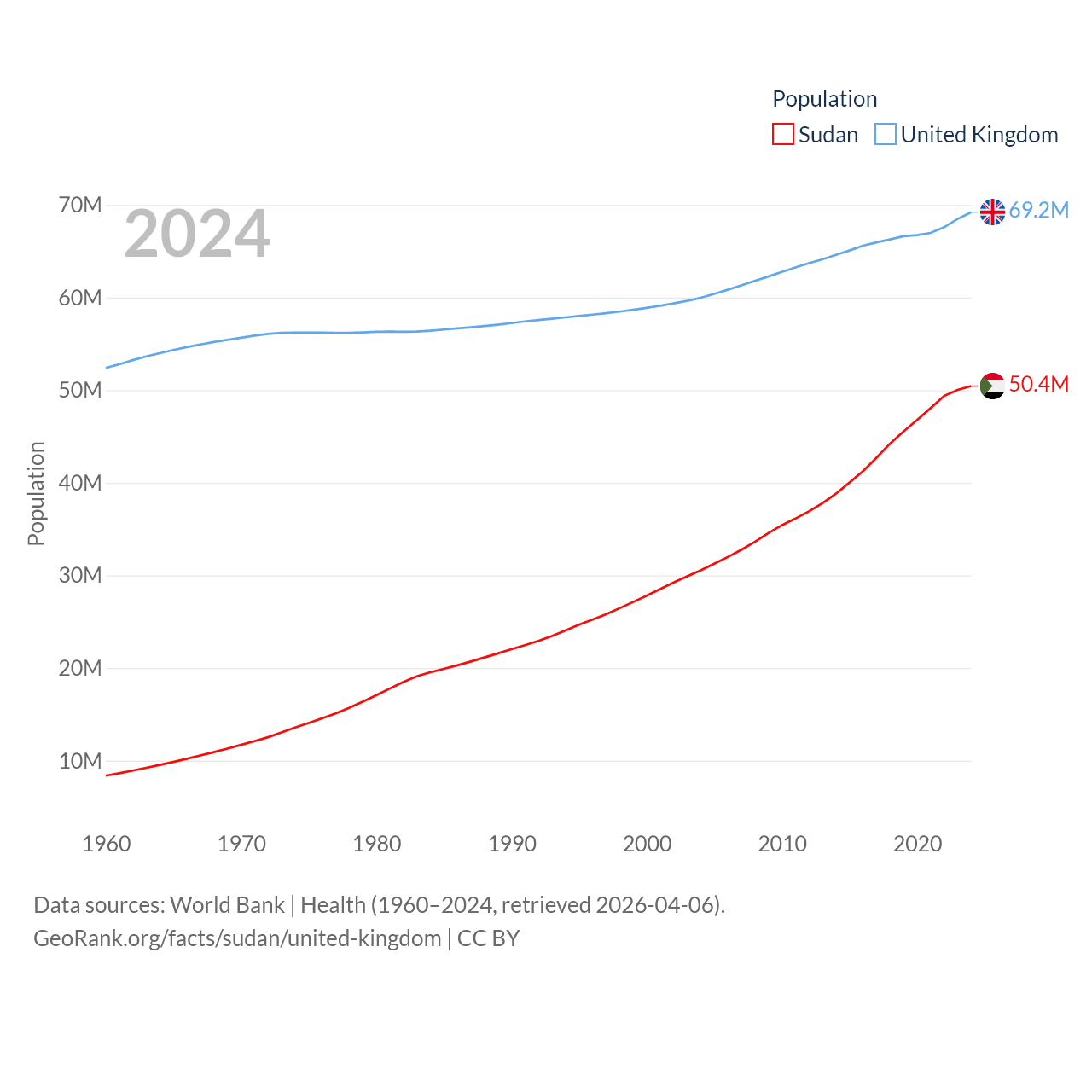 Sudan has a population of 50.4M (ranked 30/197), compared with 69.2M in The United Kingdom (ranked 21/197). Sudan's land area is 721,239 sq mi versus 93,410 sq mi for The United Kingdom (ranked 15th vs. 78th).