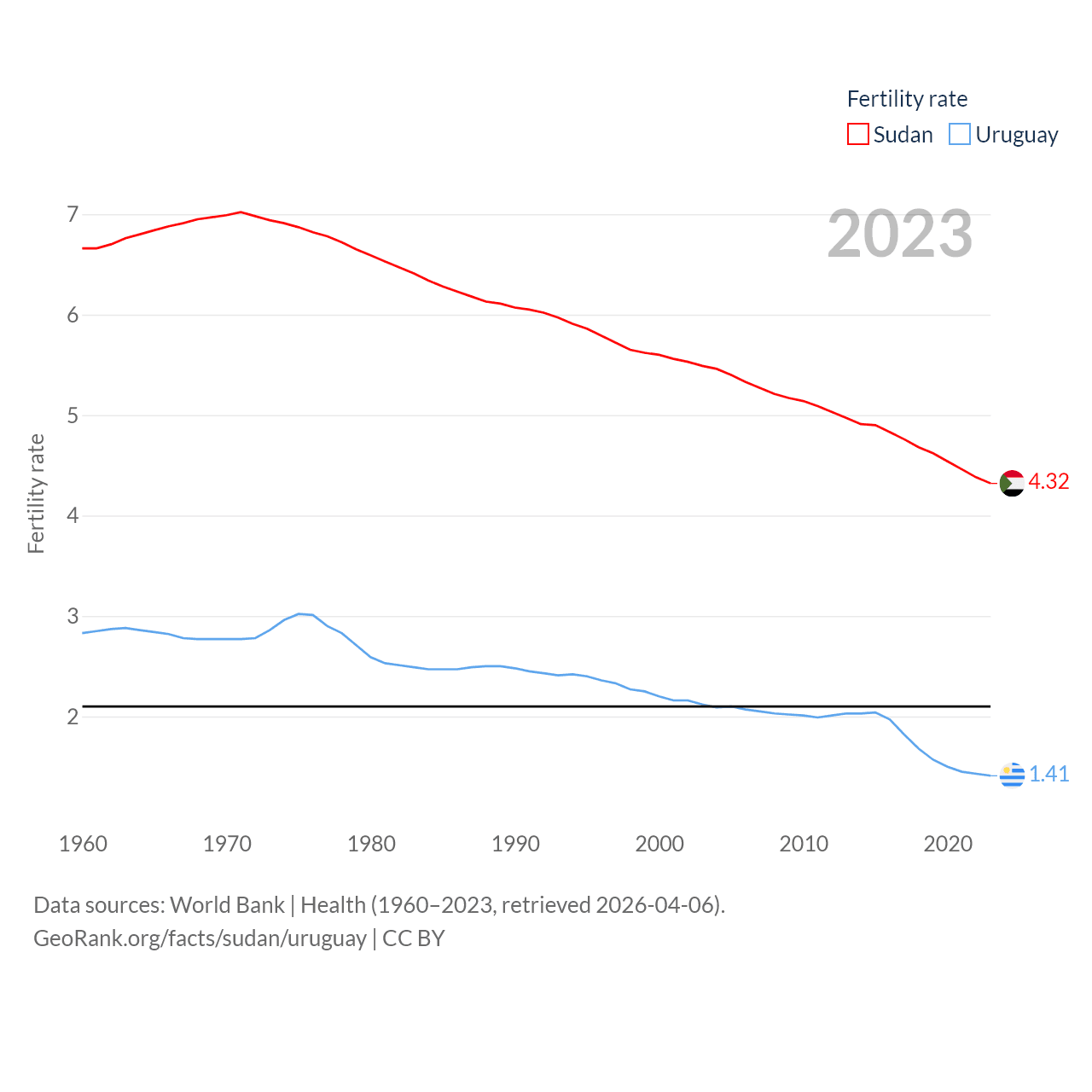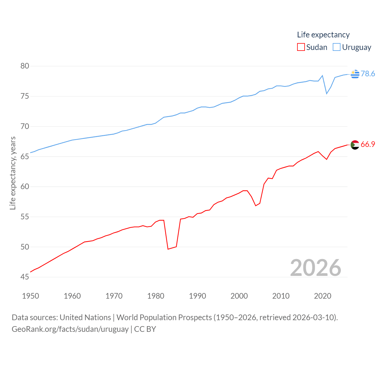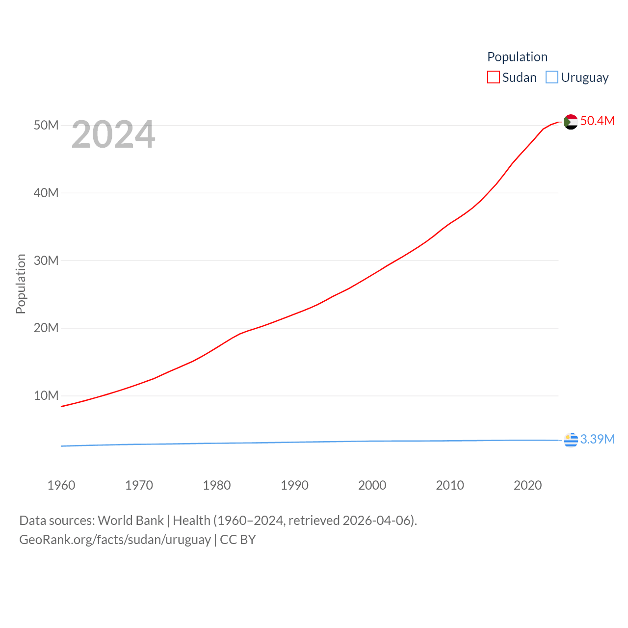 Sudan has a population of 50.4M (ranked 30/197), compared with 3.39M in Uruguay (ranked 133/197). Sudan's land area is 721,239 sq mi versus 67,576 sq mi for Uruguay (ranked 15th vs. 89th).